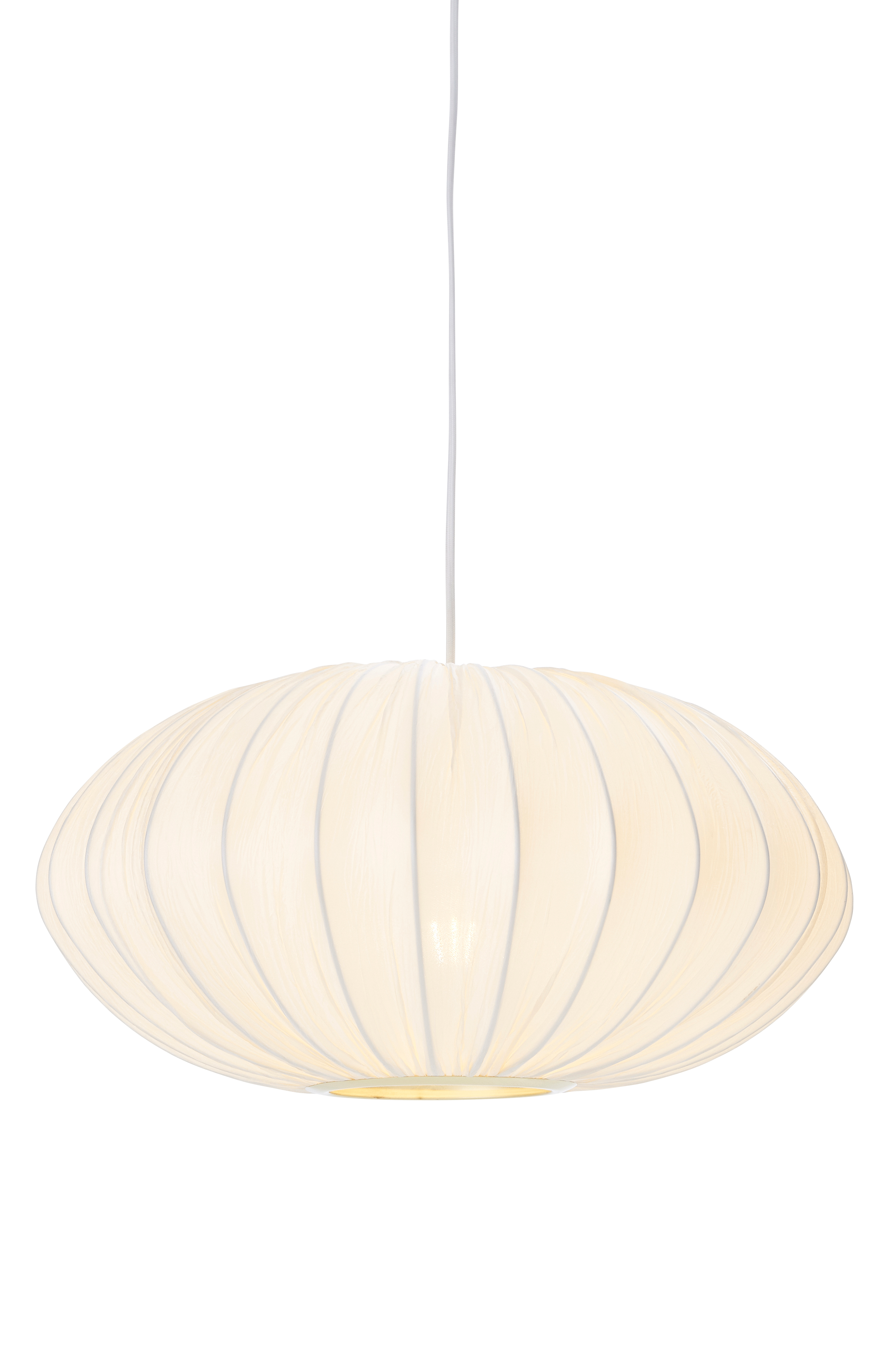 Kattovalaisin, jossa runko metallia ja päällinen ryppykäsiteltyä kangasta. Metallinen kattokuppi. Pohjassa aukko ja metallirengas antiikkimessinkiviimeistelyllä. Varjostimen mitat: Korkeus 25 cm, Ø 50 cm. Kokonaiskorkeus katosta n. 130 cm, voidaan lyhentää halutun pituiseksi. Kangaspäällysteinen johto, johdon pituus 1,2 m. Koukkuripustus. Lampunkanta E27. Valonlähde ei mukana.