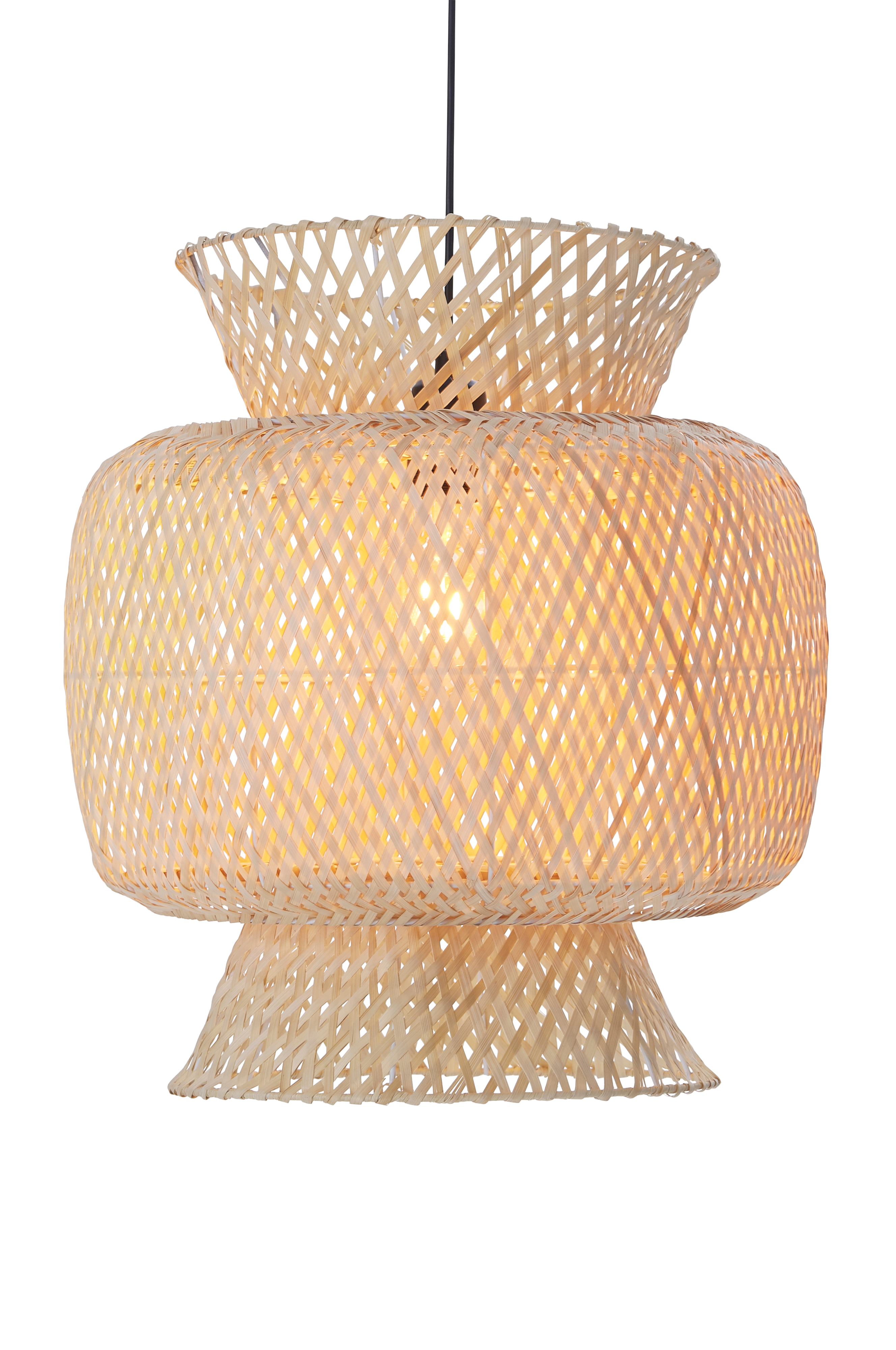 Kattovalaisin vaaleaa, punottua bambua, joka muodostaa kauniin kuvion. Kattokuppi muovia. Varjostimen koko: korkeus 50 cm, Ø 40 cm. Kokonaiskorkeus katosta n. 160 cm, voidaan lyhentää halutun pituiseksi. Kangasjohto, johdon pituus 1,2 m. Asennetaan ripustuskoukun avulla. Lampunkanta E27, enintään 40 W. Valonlähde ei sisälly toimitukseen.
