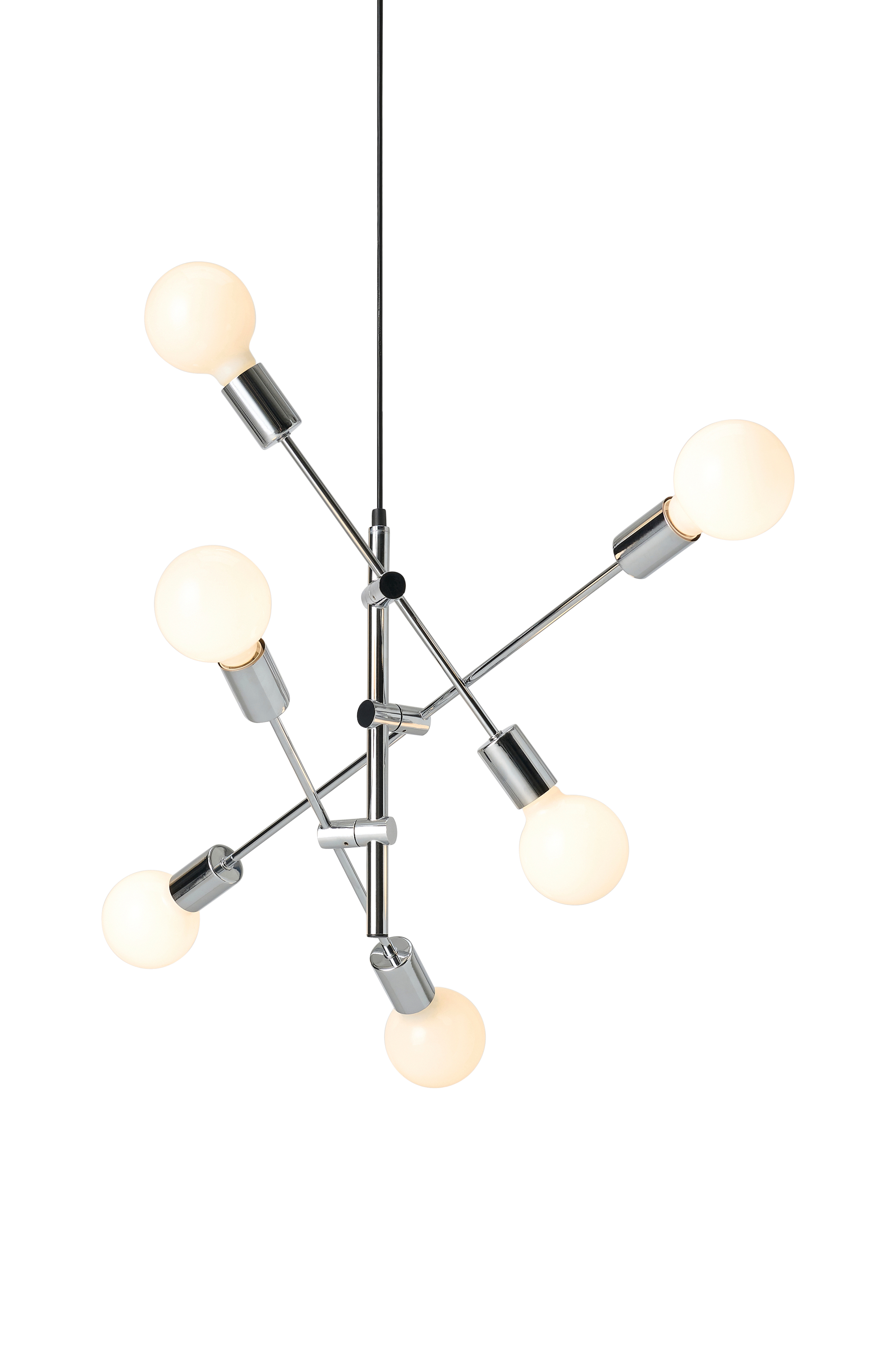 Metallinen, 3-varsinen kattovalaisin. Varret ruuvataan paikoilleen, ja niitä voidaan kallistaa. Johdon pituutta voidaan säätää. Enimmäiskorkeus kattokupista valaisimen alareunaan 131 cm. Kaksi 45 cm:n vartta ja yksi 70 cm:n varsi. Metallinen kattokuppi ja ripustuskoukku. Iso lampunkanta 6 x E27, enintään 40 wattia. Valonlähteet eivät sisälly toimitukseen.