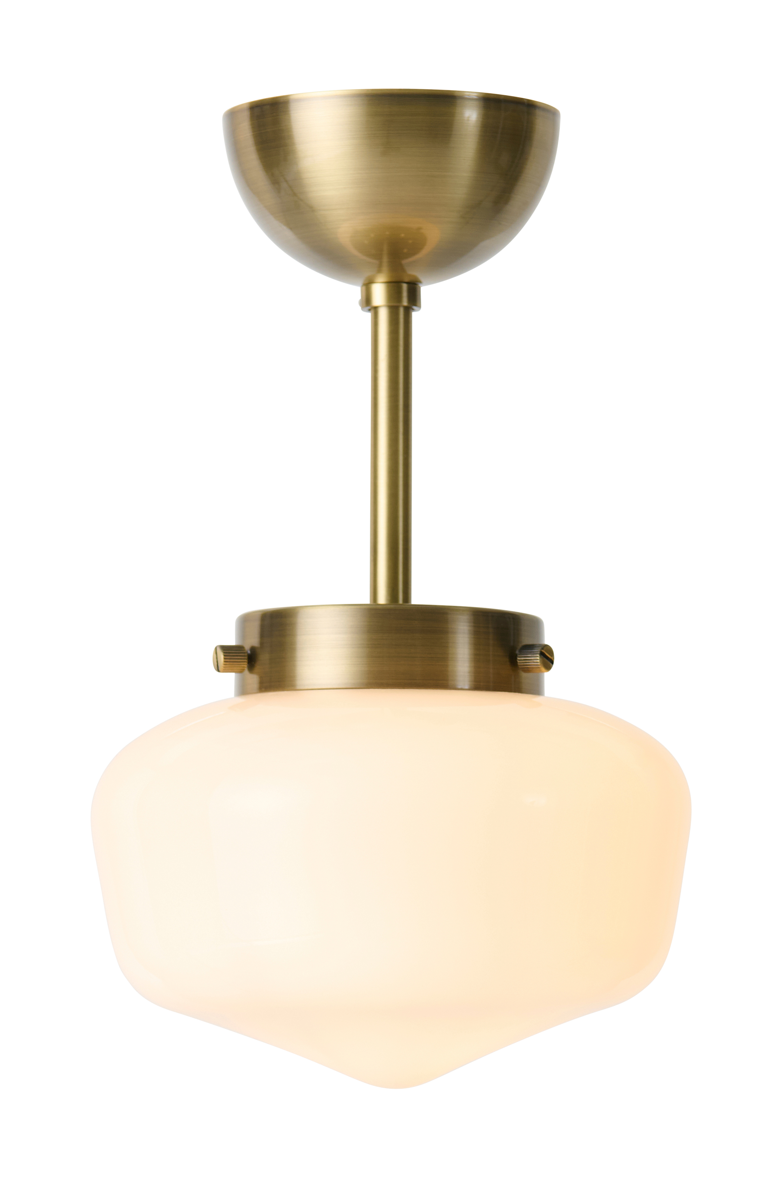 • Kattovalaisin hohtavasta, opaalinvalkoisesta lasista yksityiskohdalla messinginvärisestä metallista