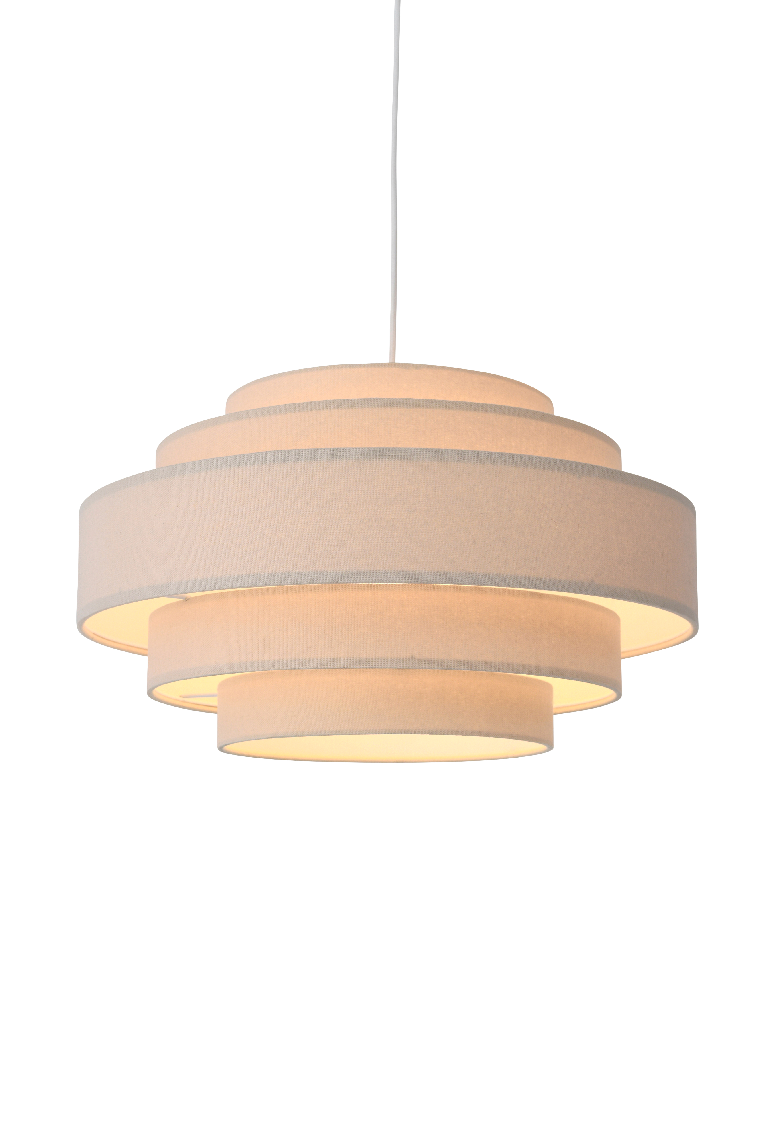 Kattovalaisin, jossa puuvillavarjostin. Varjostimessa on useita erikokoisia osioita. Muovinen kattokuppi, jossa koukku. Mitat: Ø 50 cm, kokonaiskorkeus: 150 cm, josta lampunvarjostimen korkeus 29 cm. Kangasjohto, pituus 120 cm. Iso lampunkanta E27. Enintään 5 W. Valonlähde ei sisälly toimitukseen.