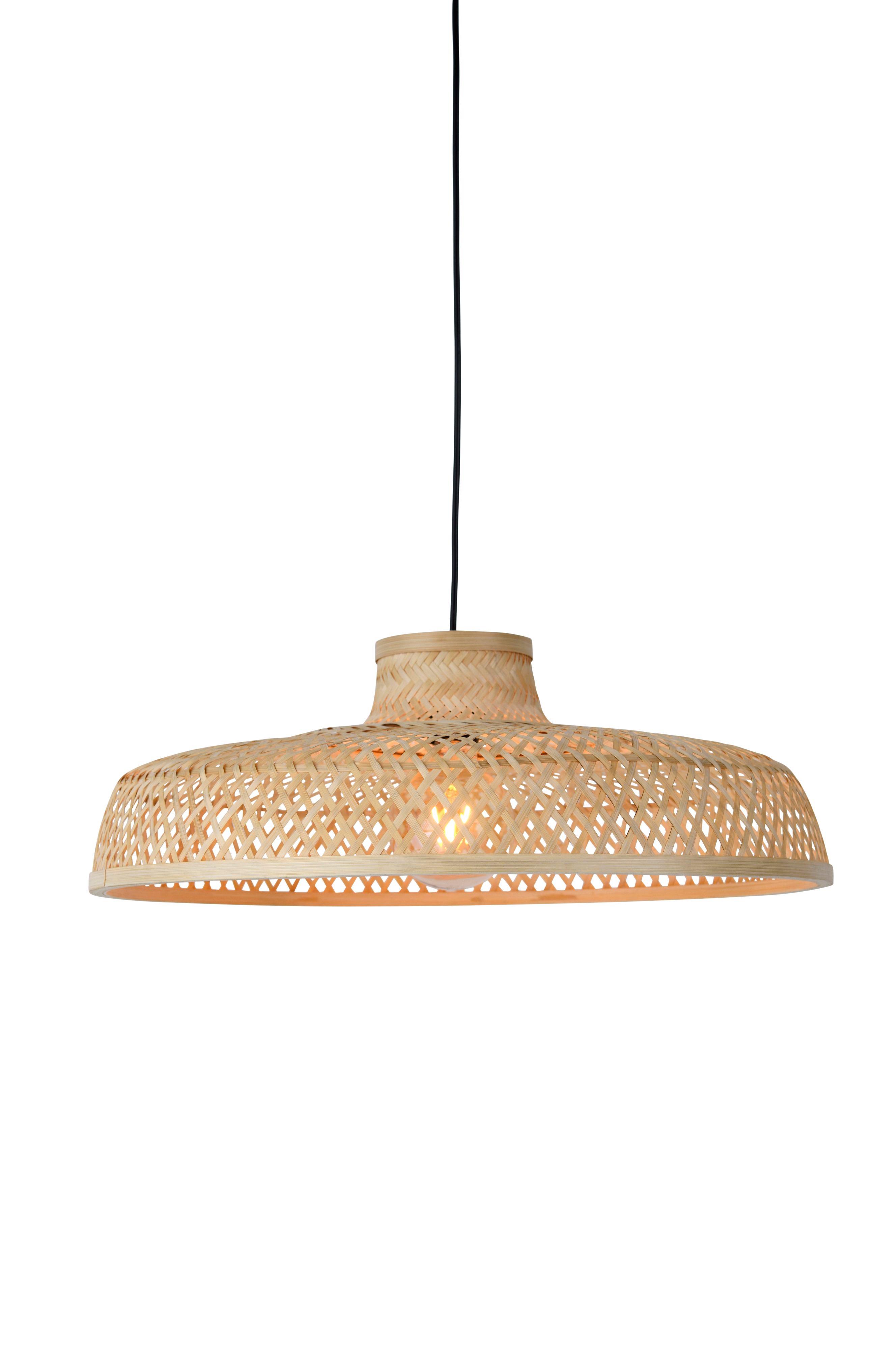 Kattovalaisin punottua bambua, joka muodostaa kauniin kuvion. Kattokuppi muovia. Varjostimen koko: korkeus 20 cm, halkaisija 53 cm. Musta johto. Kokonaiskorkeus katosta n. 149 cm, voidaan lyhentää halutulle korkeudelle. Valonlähde ei sisälly toimitukseen.