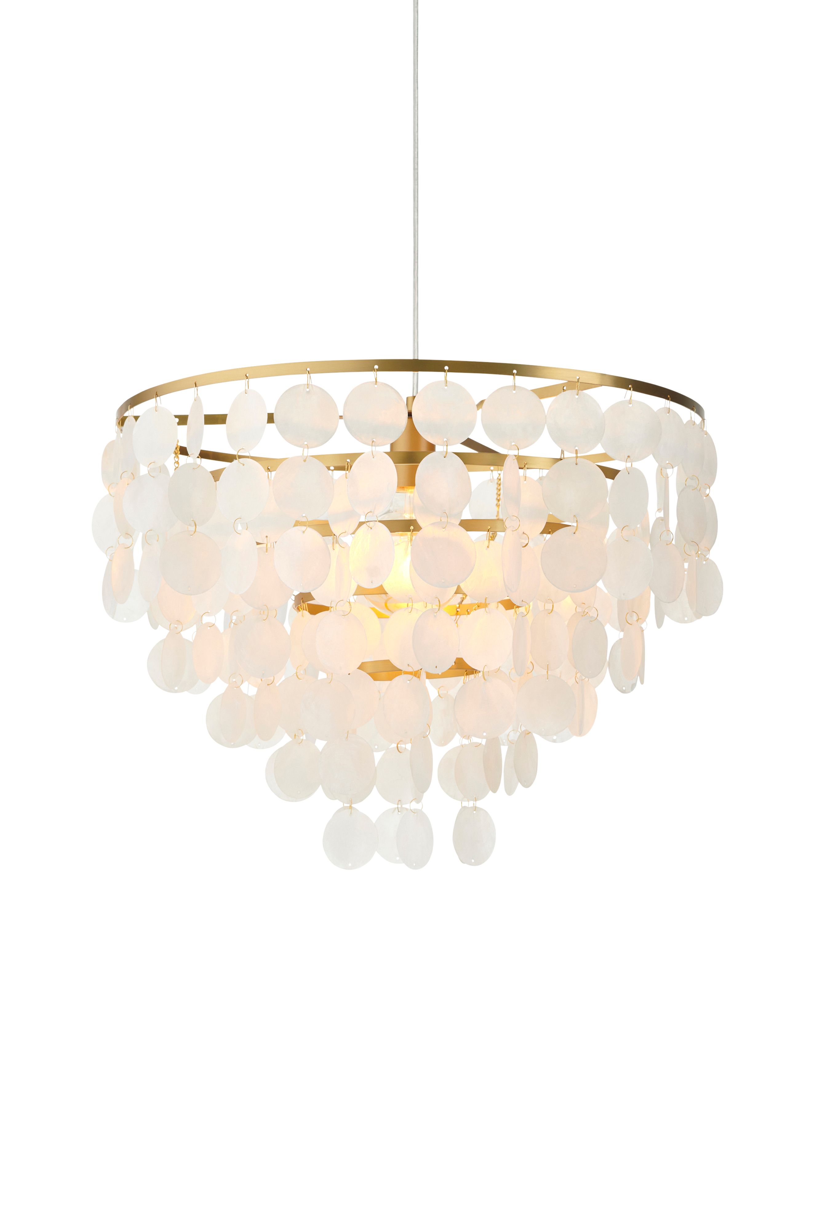 • Kattovalaisin, jossa simpukankuoret roikkuvat messinkisessä metallikehyksessä.