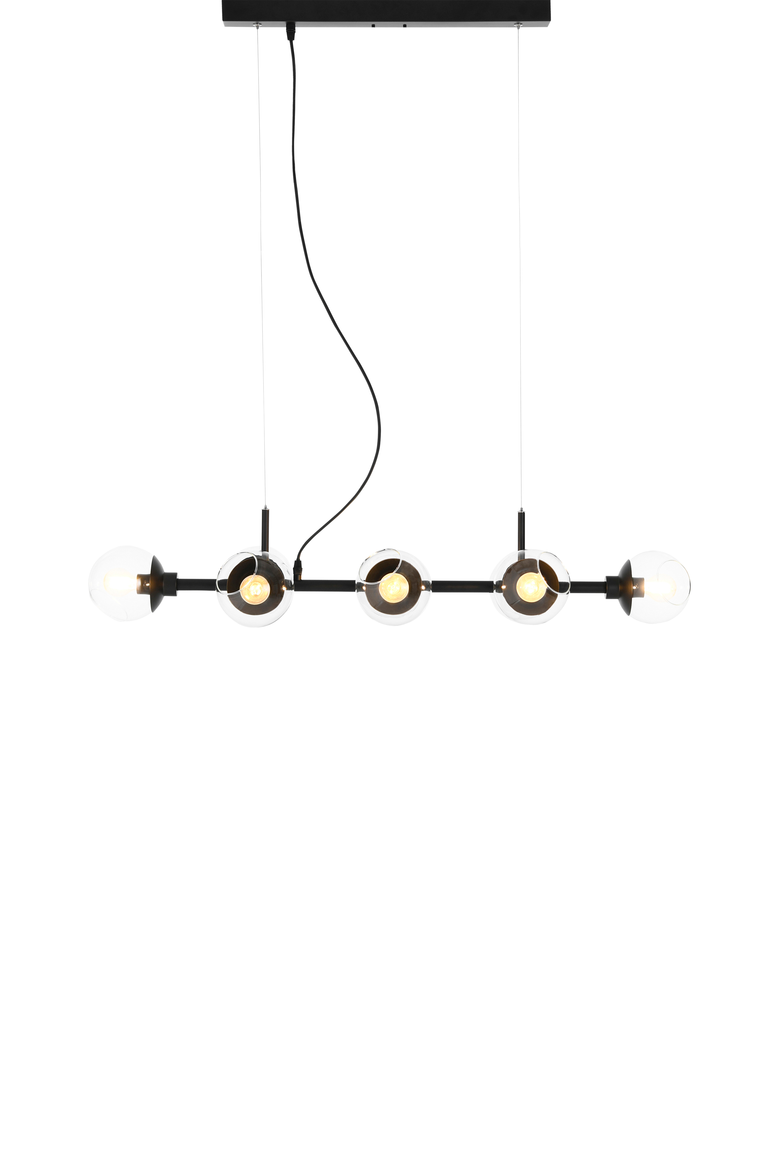 Kattovalaisin mustaa mattapintaista metallia. 8 lasikupua. Lasikuvun halkaisija 12 cm. Metallinen kattokuppi, jossa kaari. Kattokupin mitat: L55 x K5,5 x S12 cm. Lampunkanta 8 x E14.