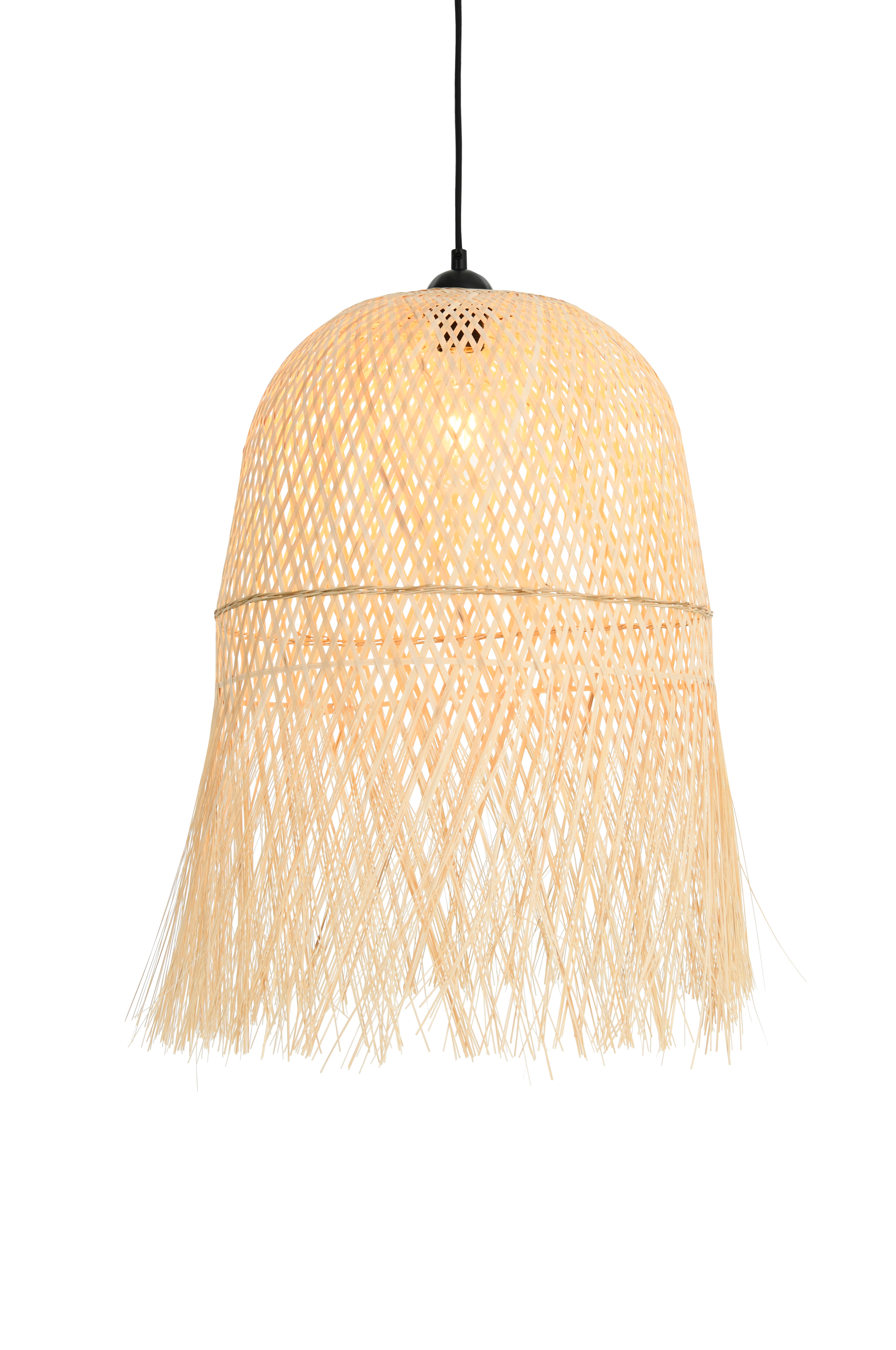 Kattovalaisin, jossa varjostin punottua luonnonväristä bambua. Varjostimen koko: korkeus 62 cm, halkaisija 45 cm. Musta kangasjohto. Kokonaiskorkeus katosta n. 172 cm, voidaan lyhentää halutun pituiseksi. Musta kattokuppi muovia. Asennetaan ripustuskoukun avulla. Tuote on tehty käsin luonnonmateriaalista bambusta, joten pieniä sävy- ja kokoeroja voi esiintyä.
