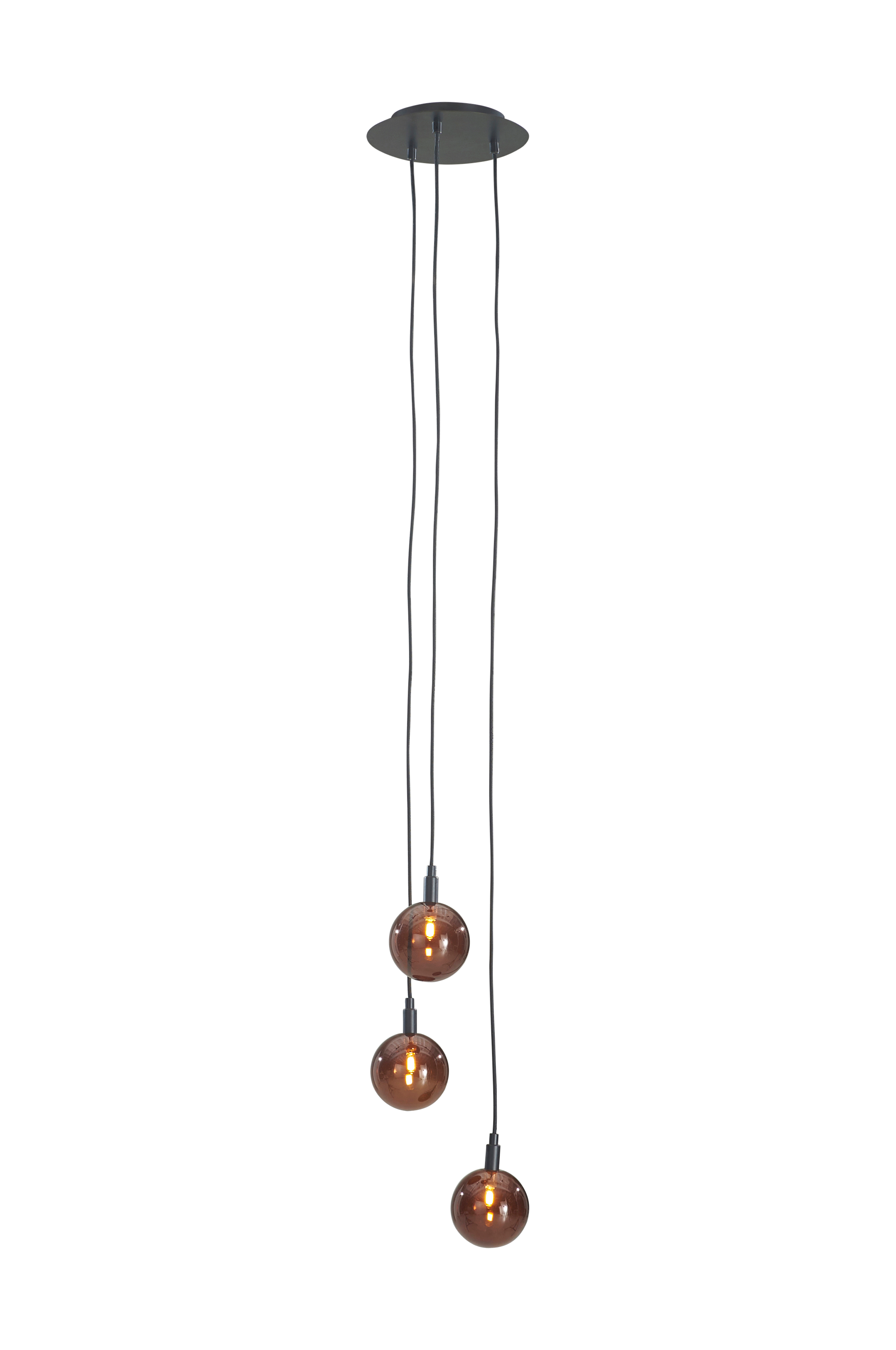 Kattovalaisin, jossa antiikkiväristä metallia ja 3 lasipalloa. Kokonaismitat: Leveys 25 cm, kokonaiskorkeus 167 cm, syvyys 25 cm. Lasipallon halkaisija 12 cm. Kolme mustaa kangasjohtoa, joiden pituudet 1,1, 1,3 ja 1,5 metriä. Johtoja voi lyhentää. Ripustetaan kattokiinnikkeen avulla. Lampunkanta 3 x G9. IP-luokka 20. Enintään 20 W. Maadoittamaton. Valonlähteet eivät sisälly toimitukseen.