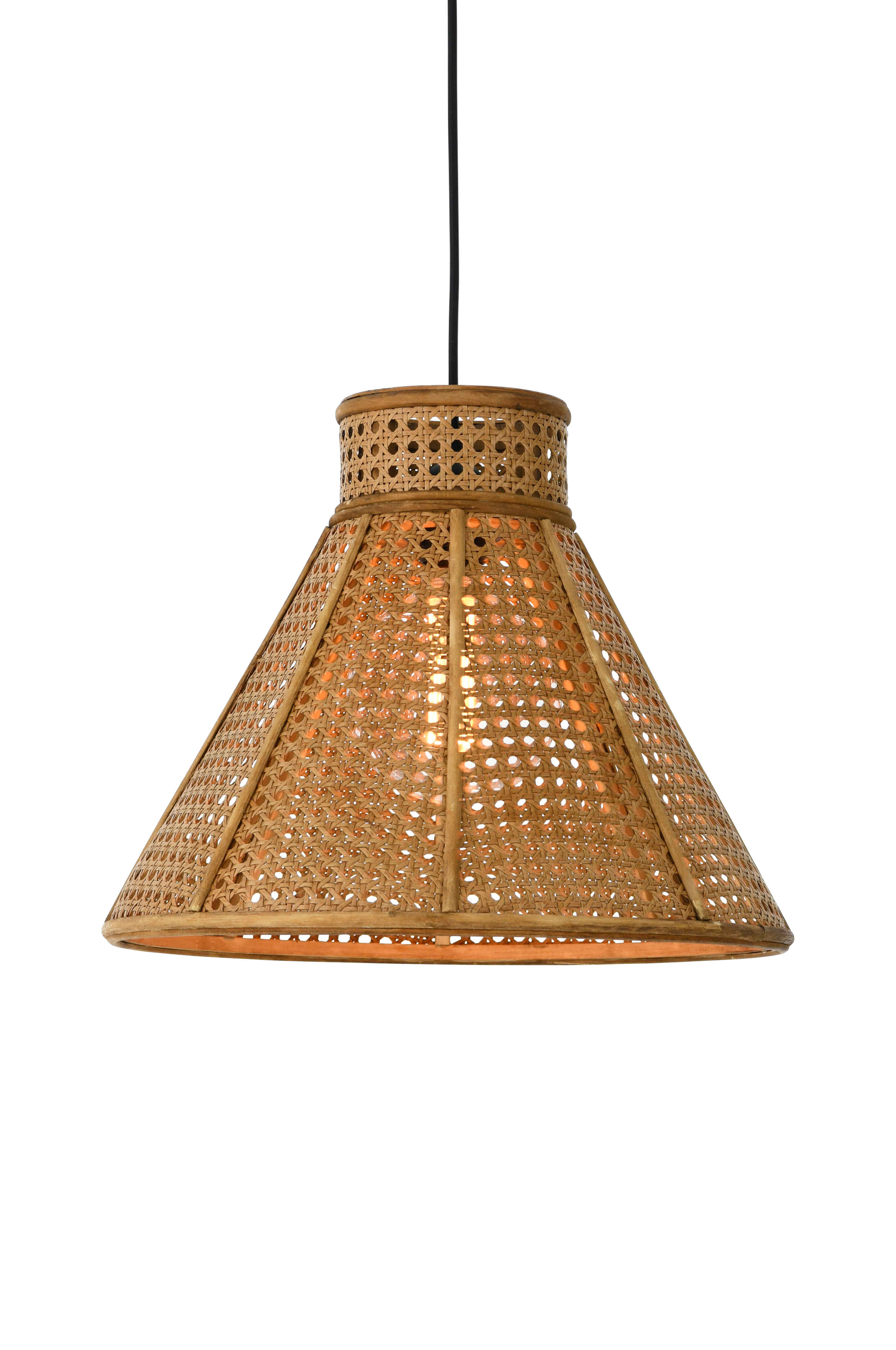 Kattovalaisin, jossa varjostin luonnollisen ruskeaa rottinkia. Kokonaiskorkeus katosta n. 150 cm. Musta kangasjohto.