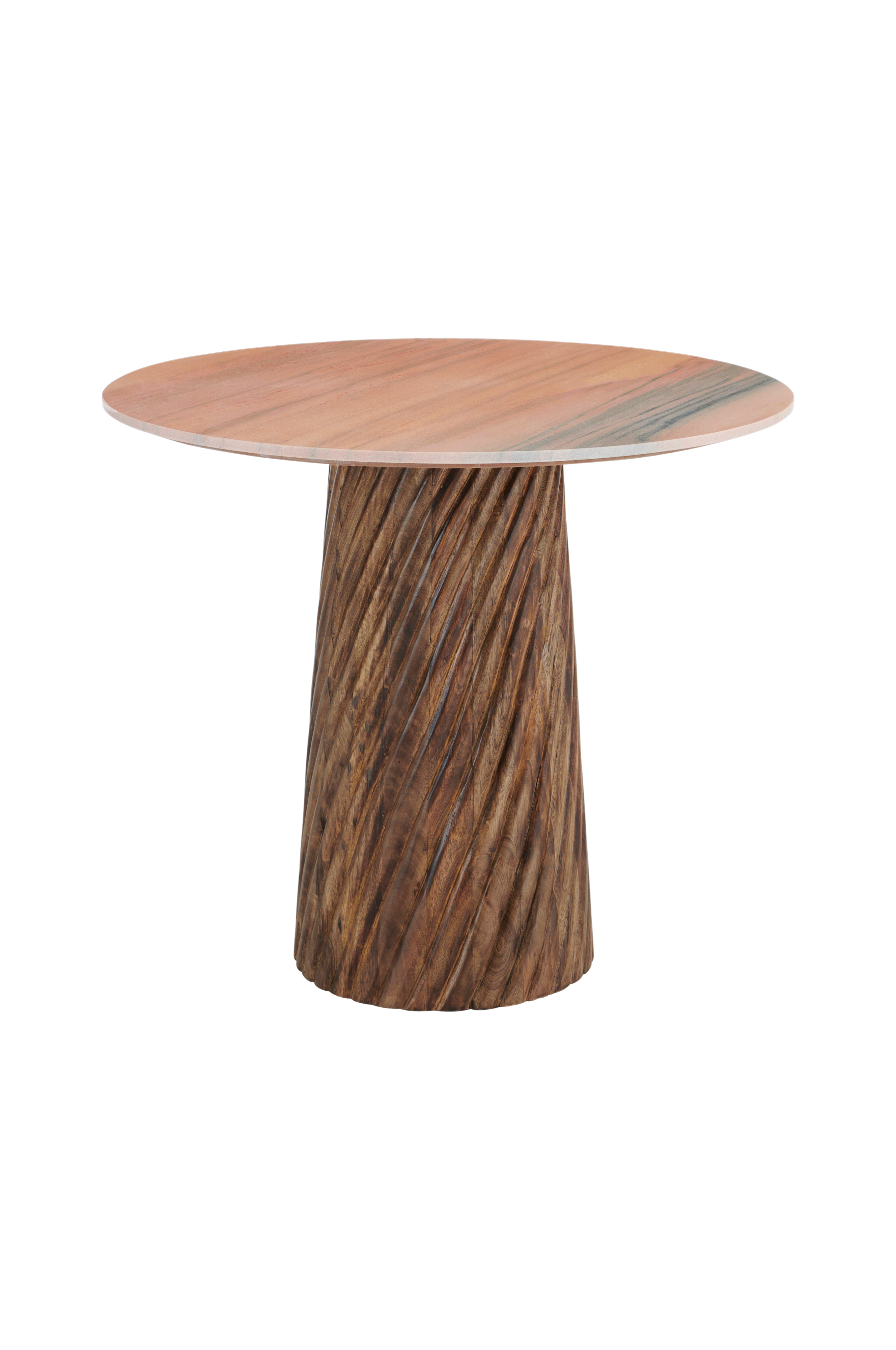 Pyöreä keittiönpöytä, jossa pöytälevy marmoria. Pöytälevyn paksuus 15 mm. Vakaa jalka mangopuuta. Jalassa on käsin kaiverrettu kiertävä kuvio ja vahattu pinta.