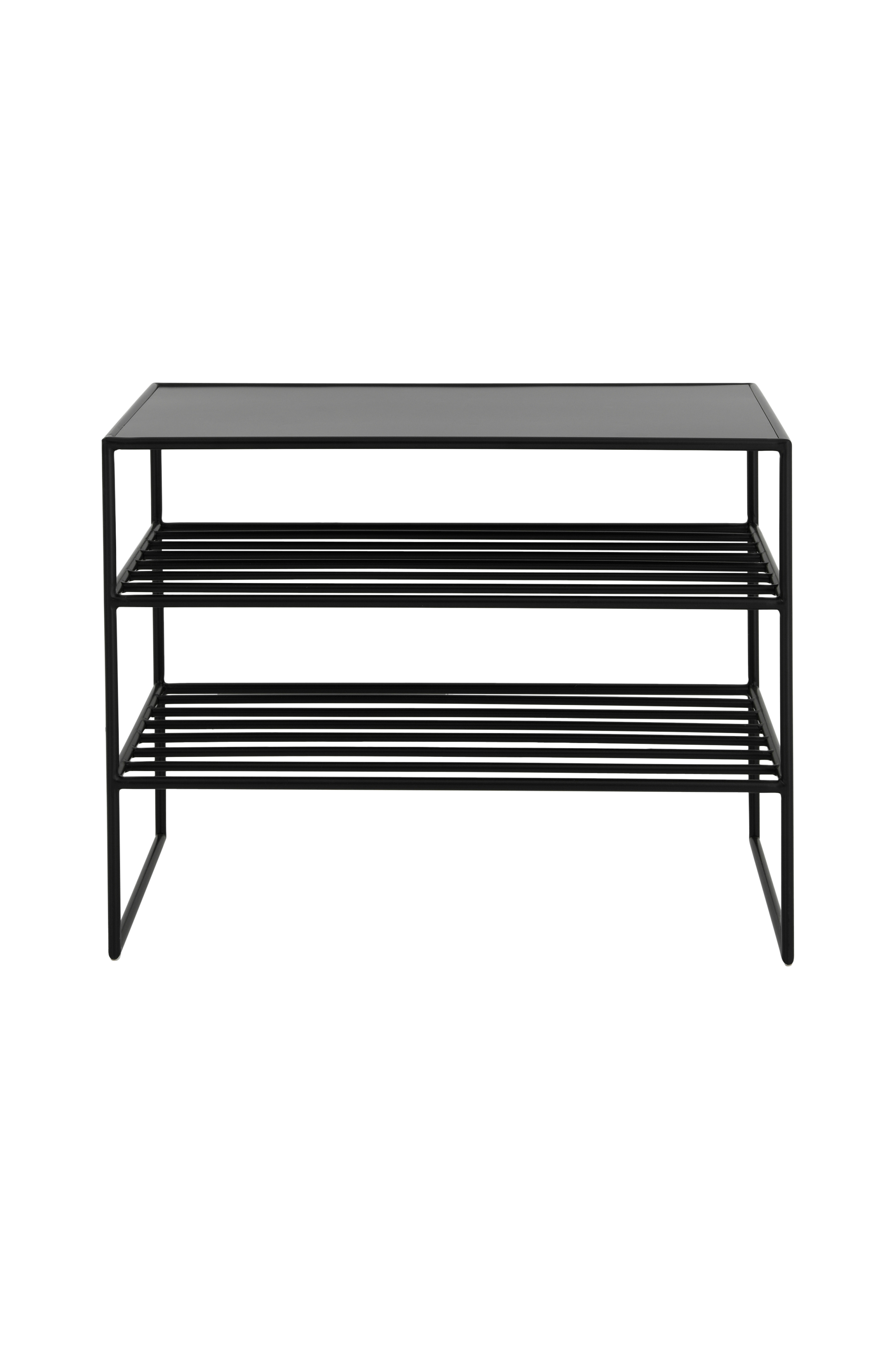 Kenkähylly/penkki jauhemaalattua metallia. Kaksi hyllytasoa päällyslevyn alla. Hyllytasojen välinen etäisyys 14/16,5 cm. Tila hyllyn alla 17 cm. Penkin enimmäiskuormitus 100 kg. Hyllytasojen enimmäiskuormitus 50 kg/hyllytaso.