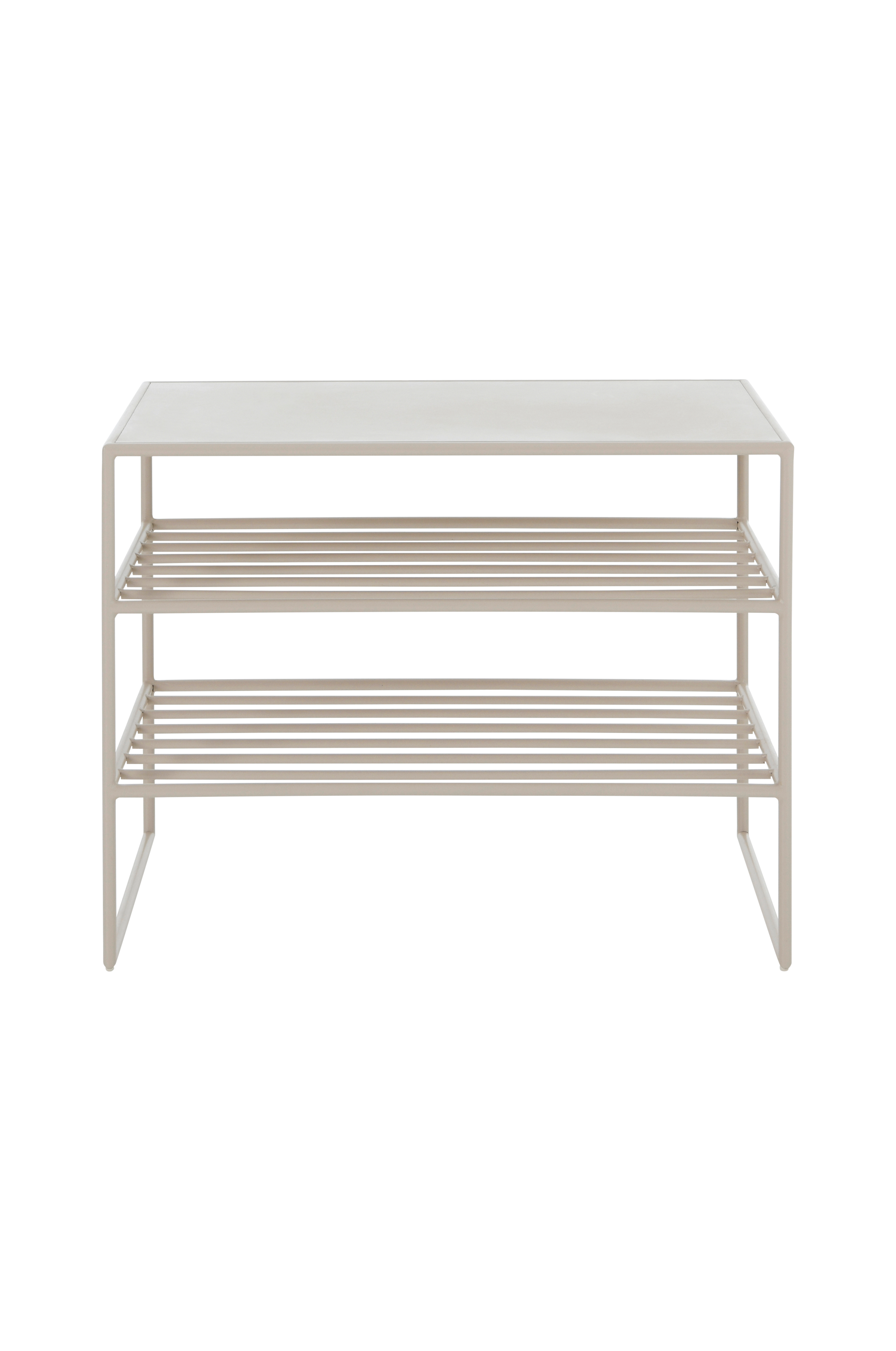 Kenkähylly/penkki jauhemaalattua metallia. Kaksi hyllytasoa päällyslevyn alla. Hyllytasojen välinen etäisyys 14/16,5 cm. Tila hyllyn alla 17 cm. Penkin enimmäiskuormitus 100 kg. Hyllytasojen enimmäiskuormitus 50 kg/hyllytaso.