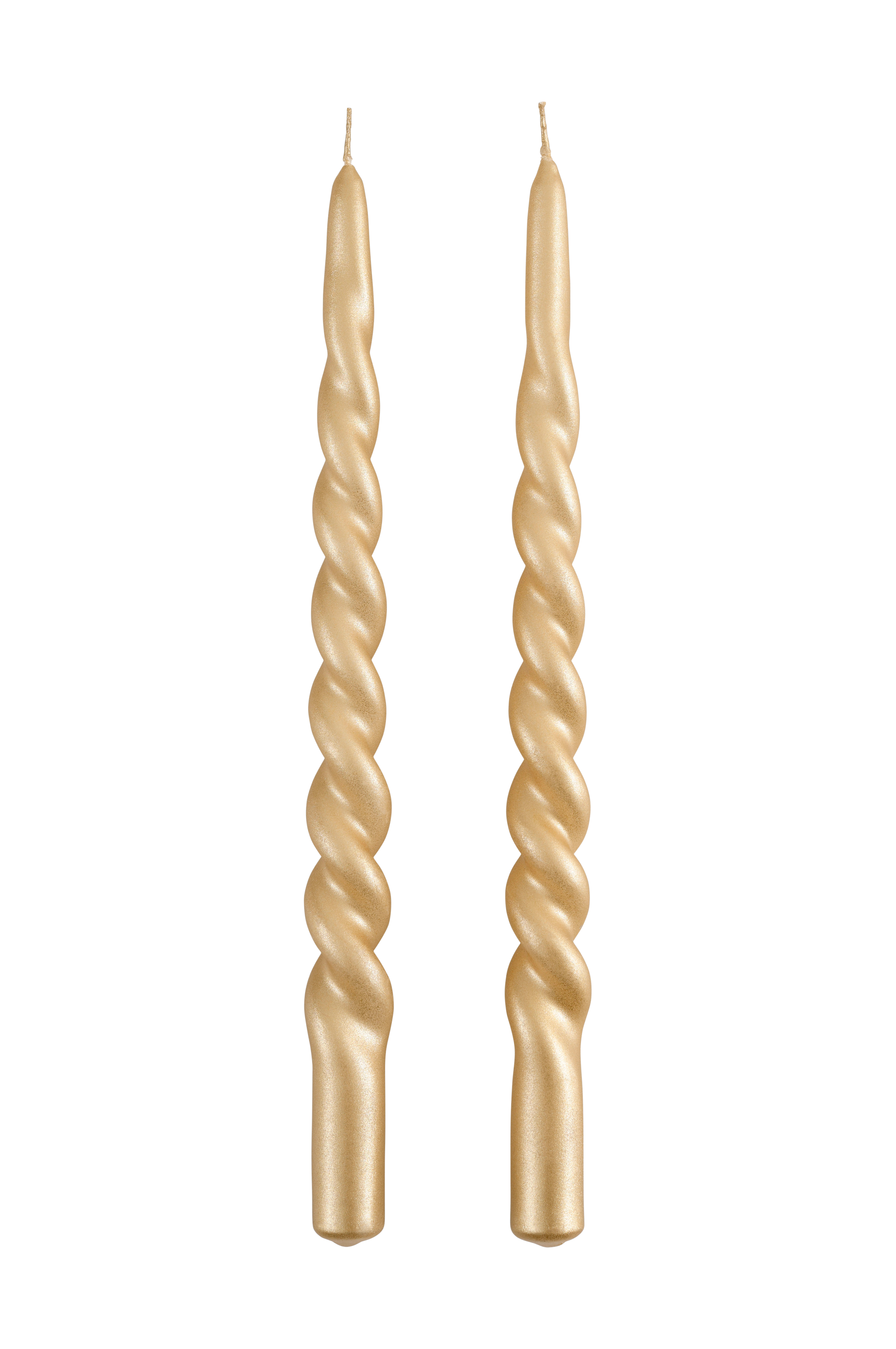 Kierretyt, litteät kynttilät, 2/pakkaus. Korkeus 29 cm, halkaisija 2,2 cm. Paloaika n. 9 tuntia. Kynttilät ovat 100% parafiinia. Parafiinia käytetään steariinin sijaan, koska se on pehmeämpi materiaali, jolloin kynttilän voi muotoilla ja kiertää. Tämä ei onnistu steariinilla, joka on liian kovaa kierrettäväksi.