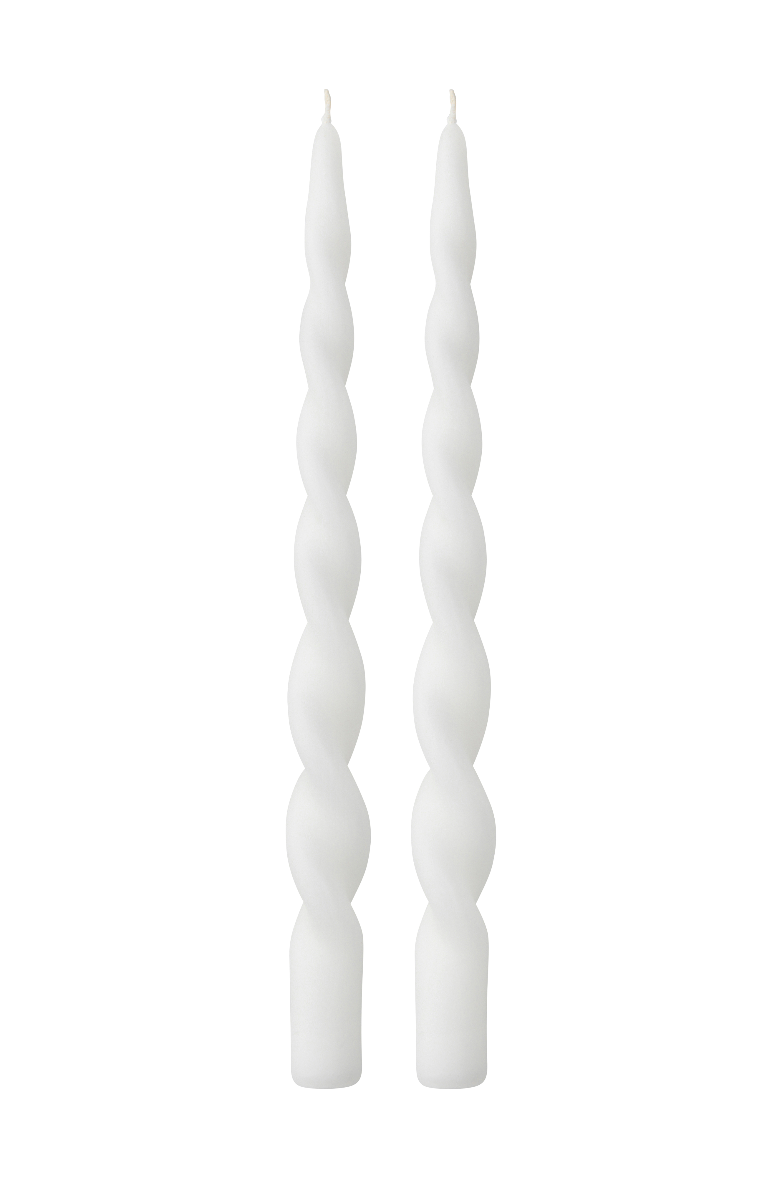 Kierretyt, litteät kynttilät, 2/pakkaus. Korkeus 29 cm, halkaisija 2,2 cm. Paloaika n. 9 tuntia. Kynttilät ovat 100% parafiinia. Parafiinia käytetään steariinin sijaan, koska se on pehmeämpi materiaali, jolloin kynttilän voi muotoilla ja kiertää. Tämä ei onnistu steariinilla, joka on liian kovaa kierrettäväksi.