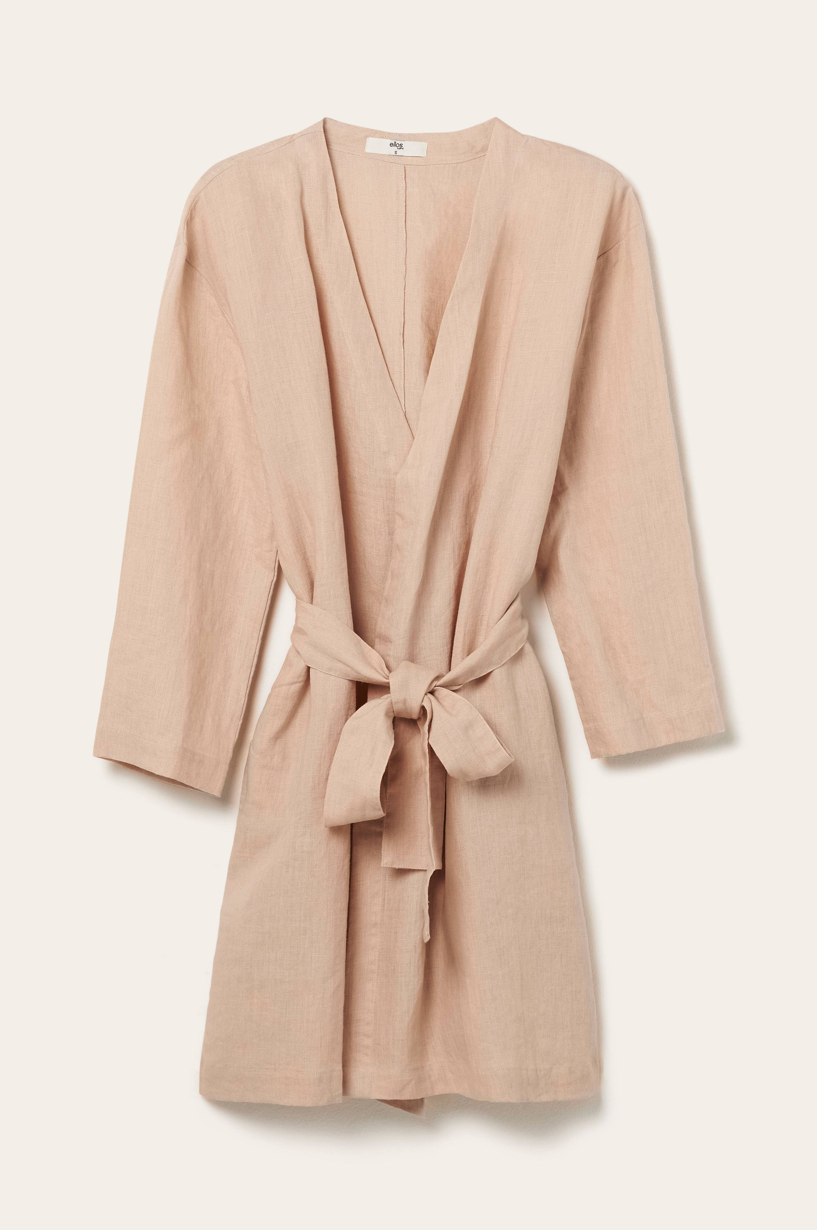 Kimono pehmeää ja viileää pestyä ranskalaista pellavaa. Polvipituinen malli, jossa rento ja väljä istuvuus. Pitkät hihat. Irrotettava solmimisvyö vyötäröllä. Kaksi taskua. Pituus n. 97 cm koossa M.