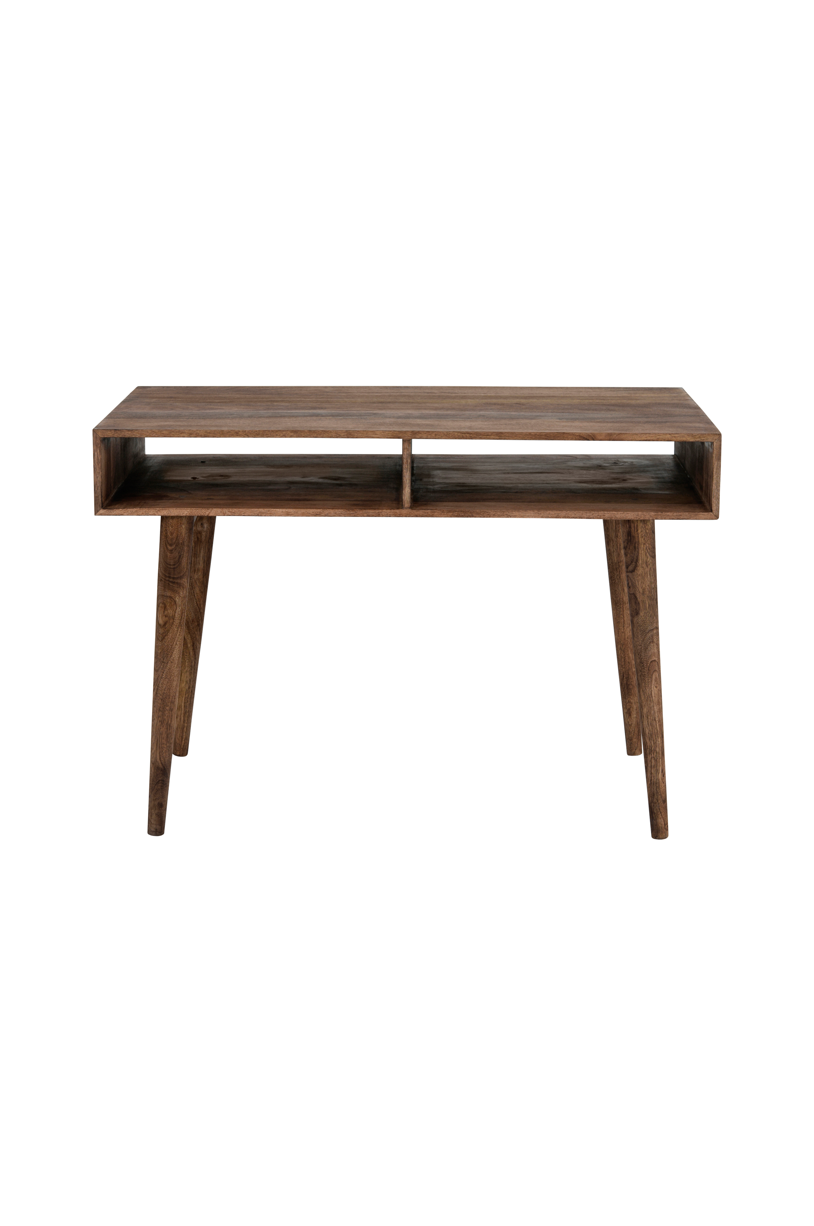 Kirjoituspöytä petsattua mangopuuta. Kaksi säilytyslokeroa. Tila huonekalun alla 60 cm. Säilytyslokeroiden korkeus 12 cm. Helposti koottava.