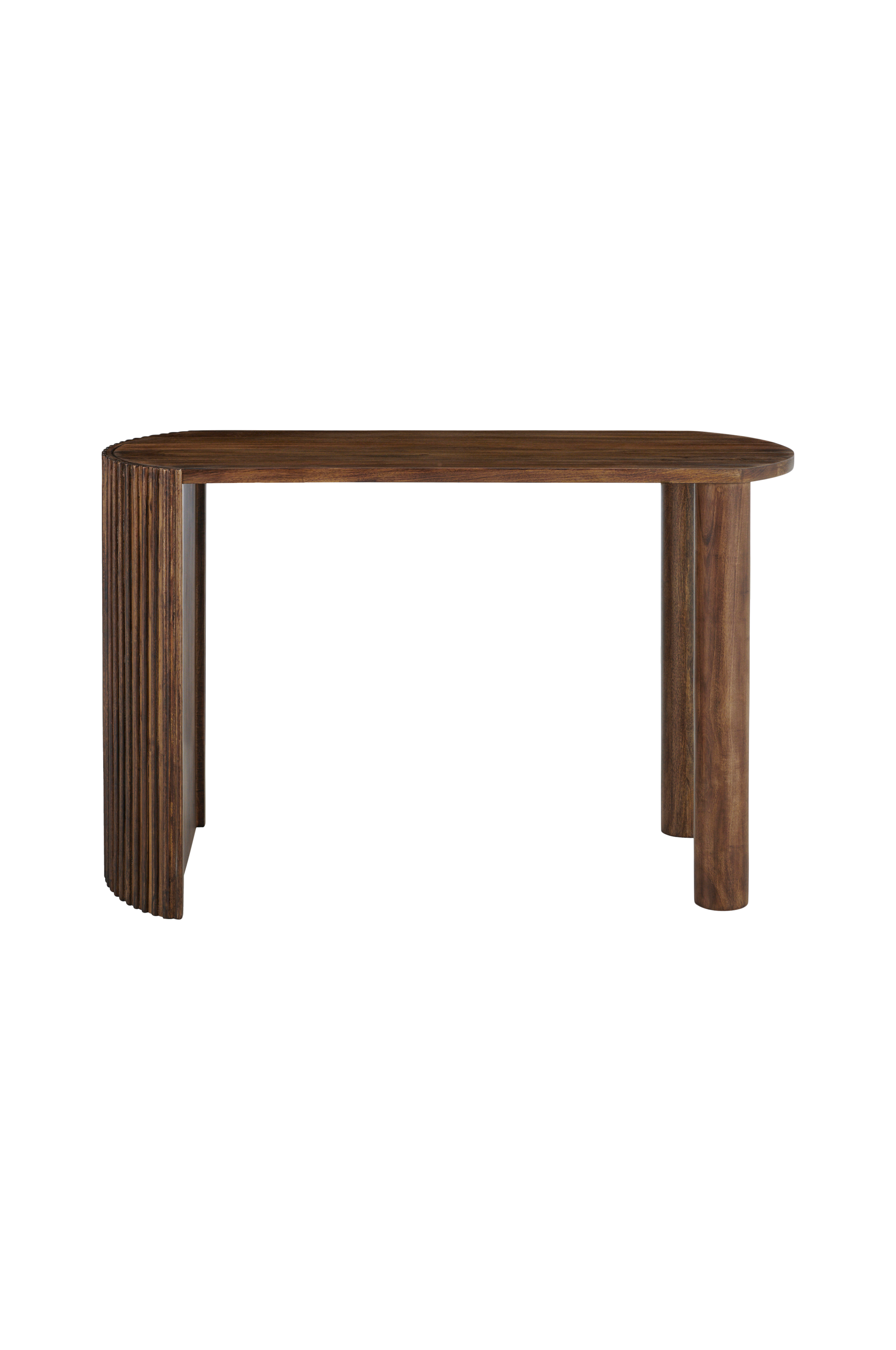 Kirjoituspöytä/sivupöytä massiivista, ruskeaksi petsattua mangopuuta, jossa vahattu pinta. Rimoitettu jalusta yhdellä sivulla ja kaksi pyöreää, jykevää jalkaa toisella sivulla. Korkeus lattiasta alareunaan 72,5 cm. • Tuote sisältää FSC-sertifioitua puuta, joka on hakattu kestävästi ja vastuullisesti hoidetusta metsästä ja jonka tuotannossa on huomioitu sekä ihmiset että ympäristö.
