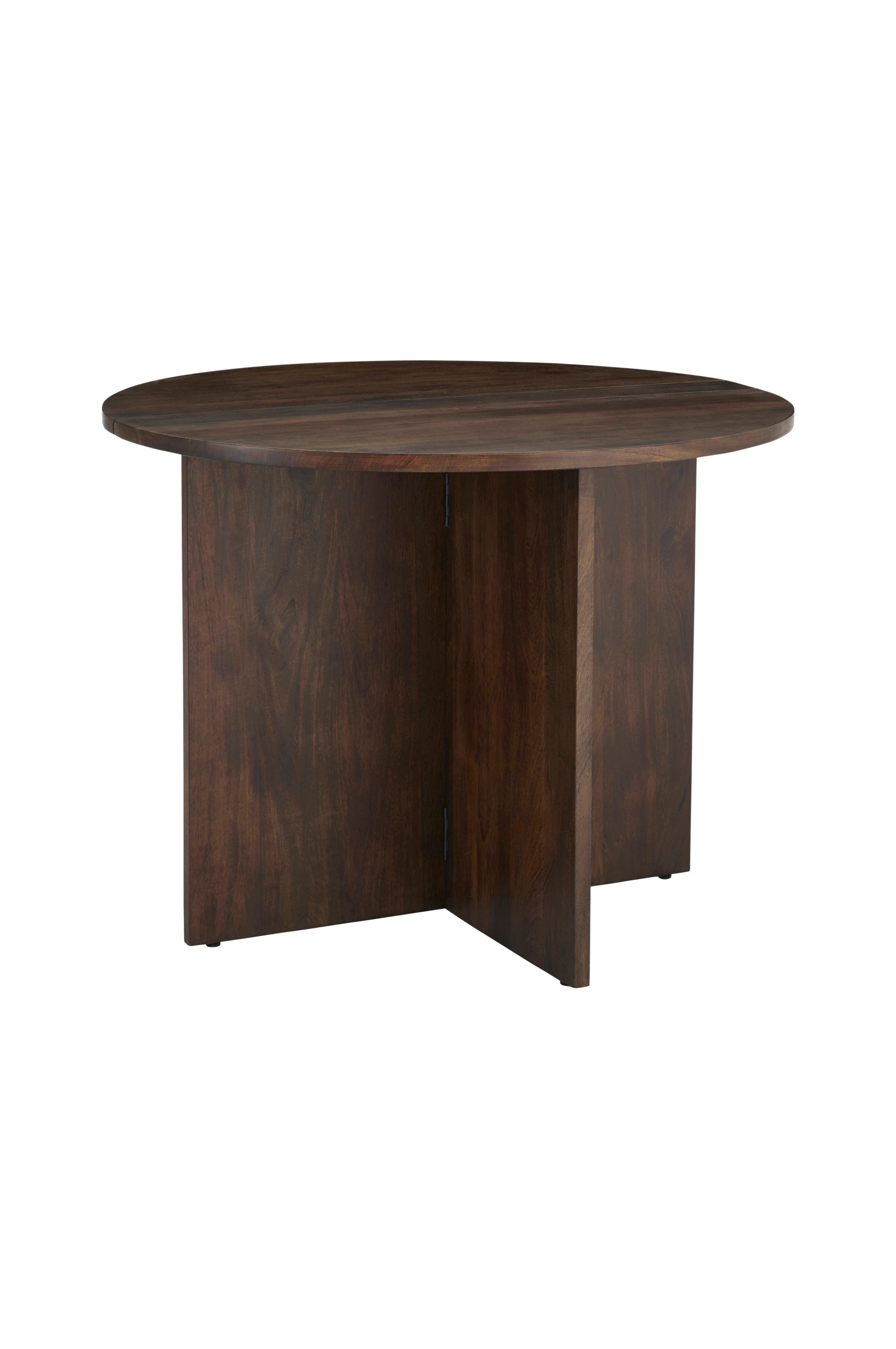 Pyöreä klaffipöytä/ruokapöytä vahapintaista mangopuuta. Jatkolevyn leveys 45 cm.