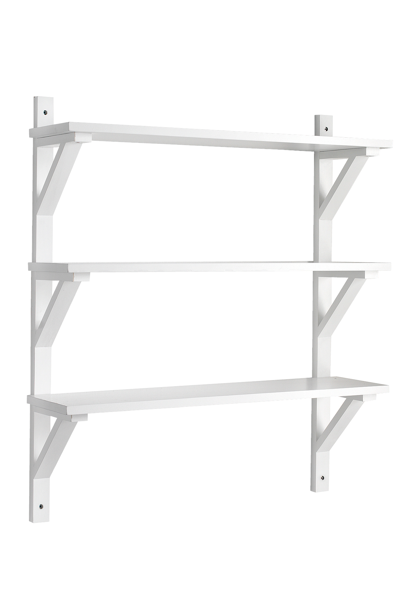 Konsolihyllykkö maalattua koivua. Kolme hyllytasoa. Korkeus 90 cm. Leveys 80 cm. Syvyys 22,5 cm. Hyllytasojen välinen etäisyys 26 cm. Enimmäiskuormitus/hyllytaso 6 kg. Toimitetaan osina.