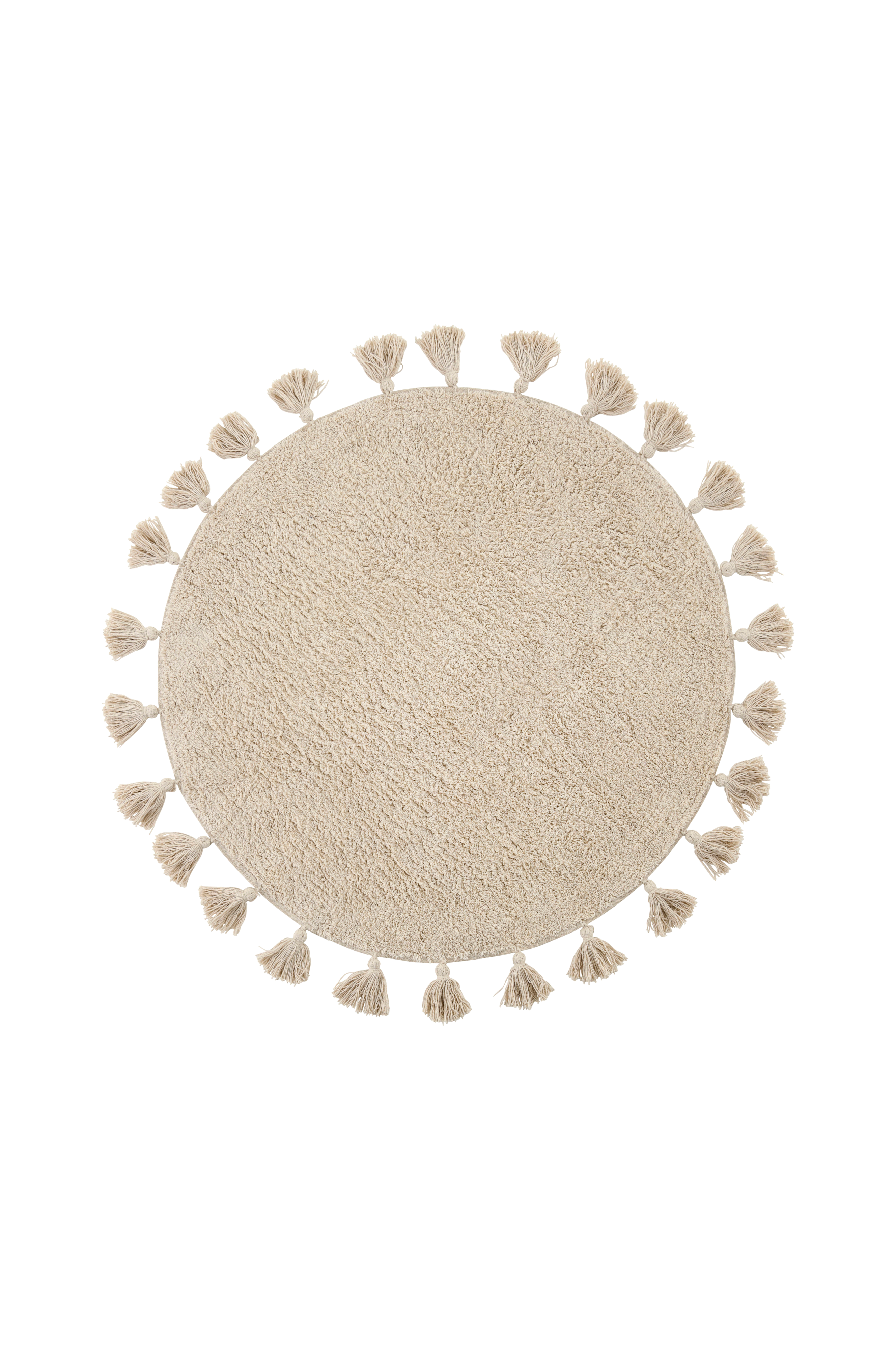 Pyöreä, tuftattu kylpyhuonematto puuvillaa. Tupsut ympäriinsä.
