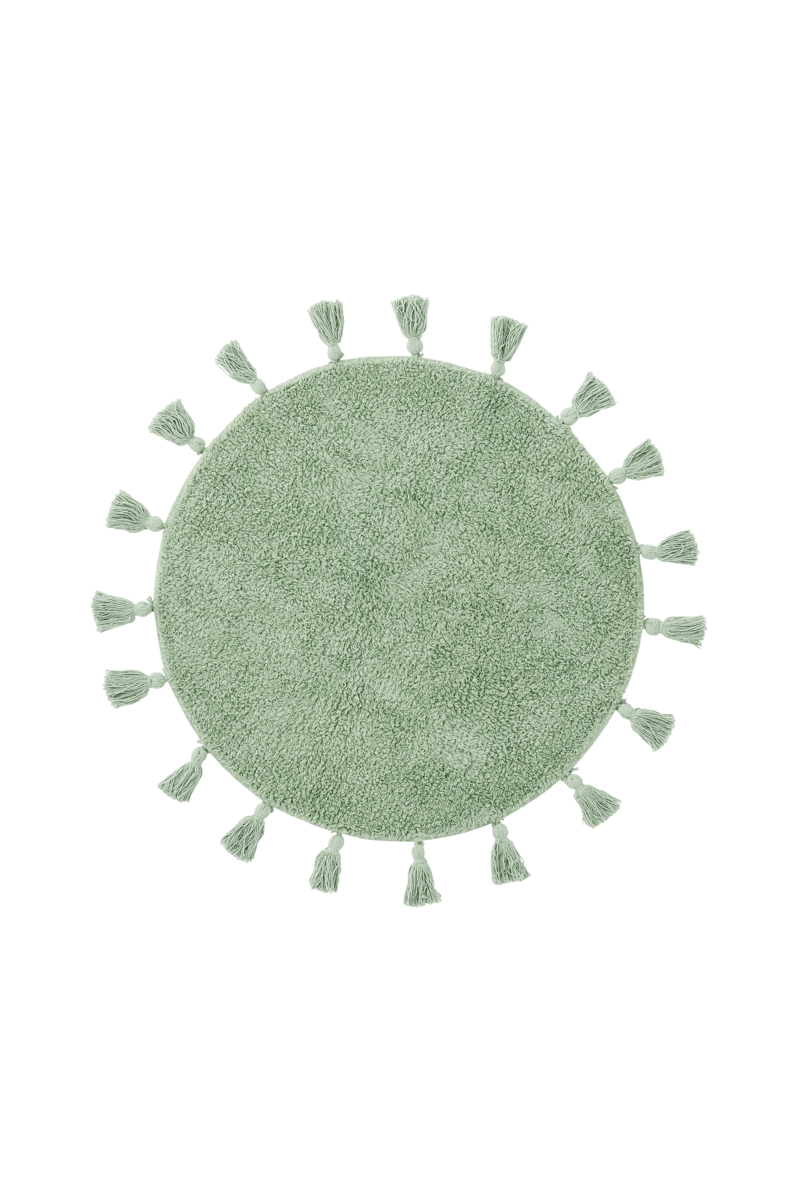 Pyöreä, tuftattu kylpyhuonematto puuvillaa. Tupsut ympäriinsä.
