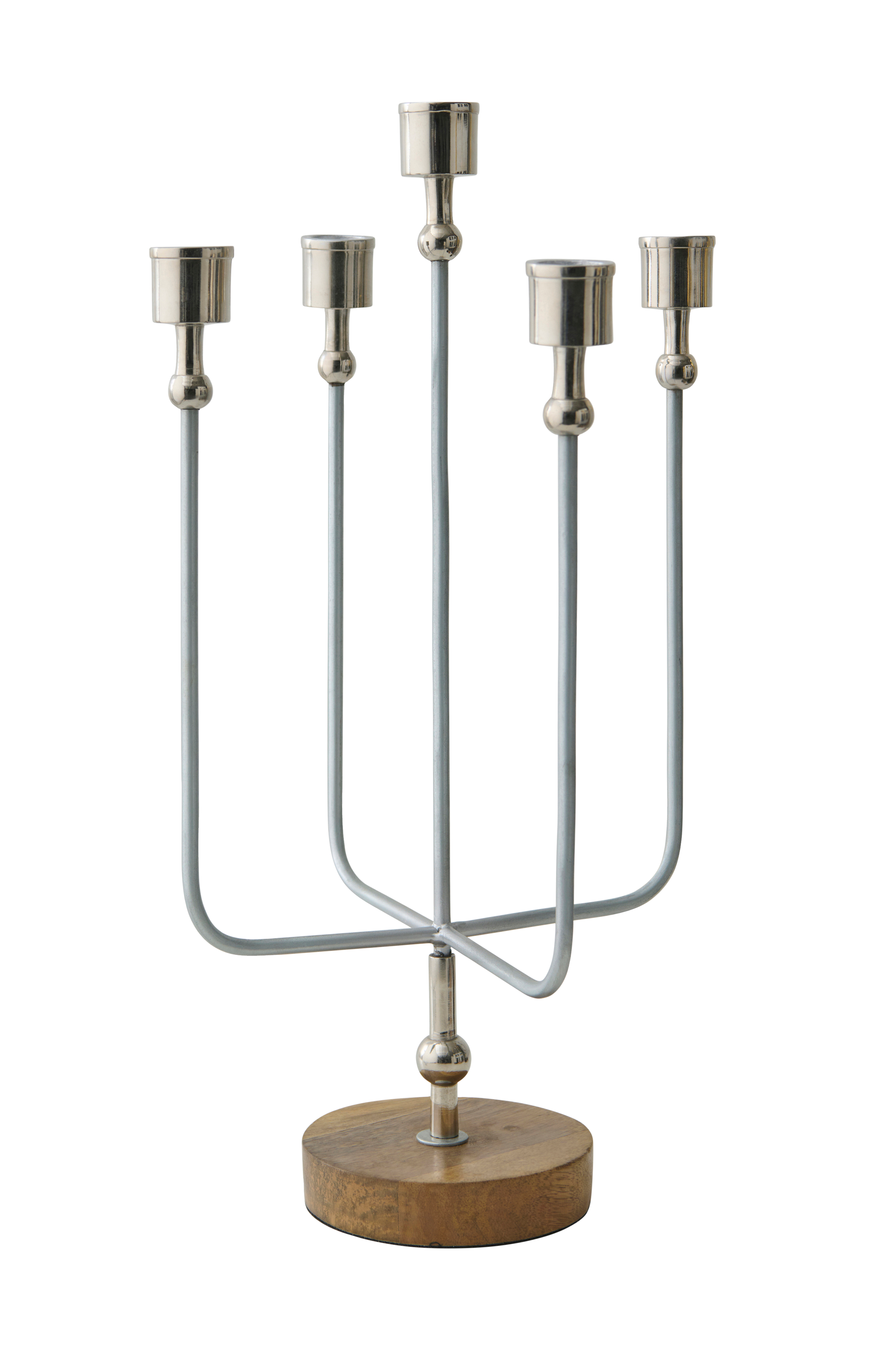 5-haarainen metallinen kynttelikkö, jossa puinen jalka.