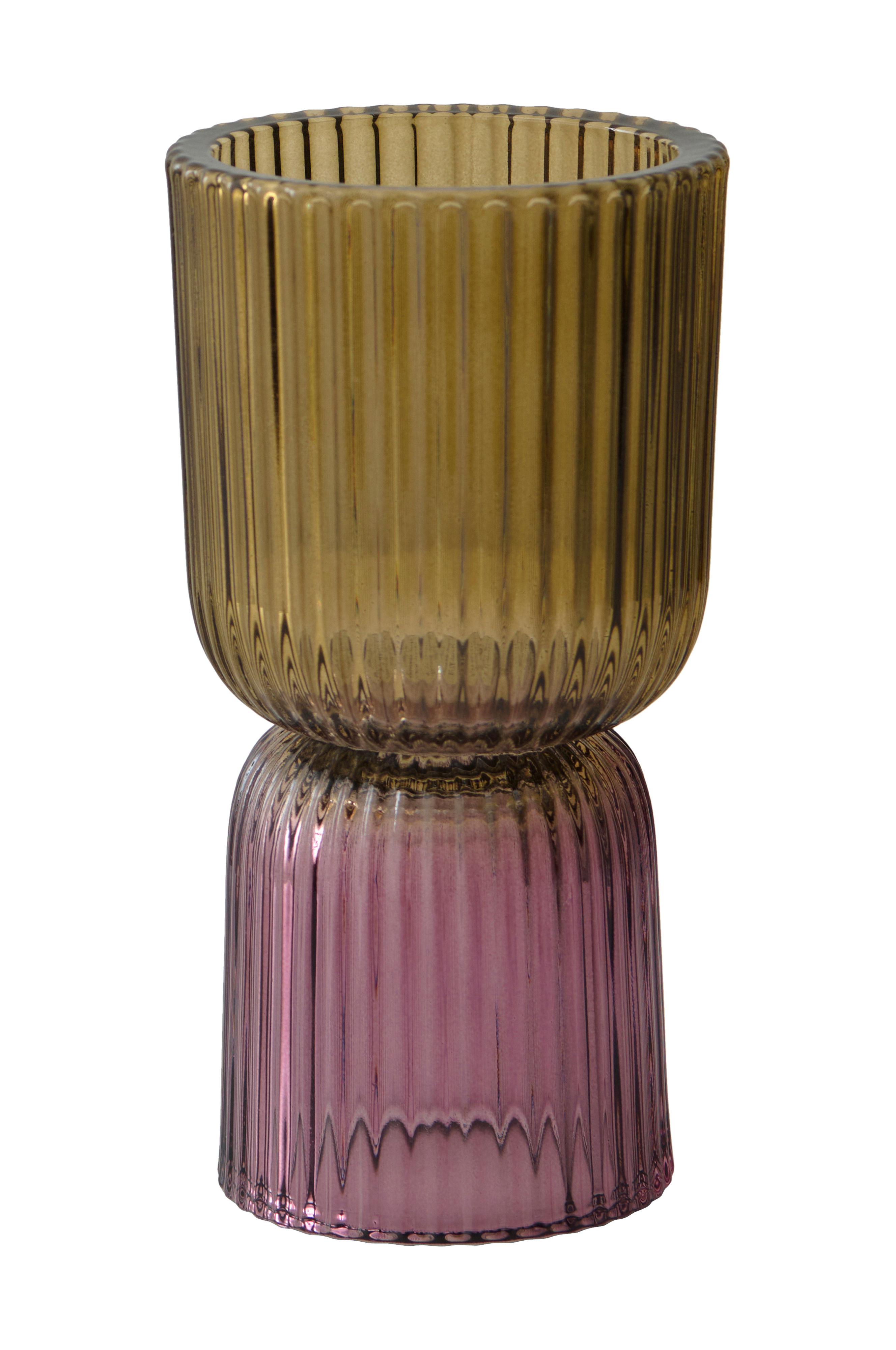 Lasinen kynttilälyhty, jossa uurrettu struktuuripinta. Halkaisija ylhäällä 9 cm, halkaisija alhaalta 7,5 cm.