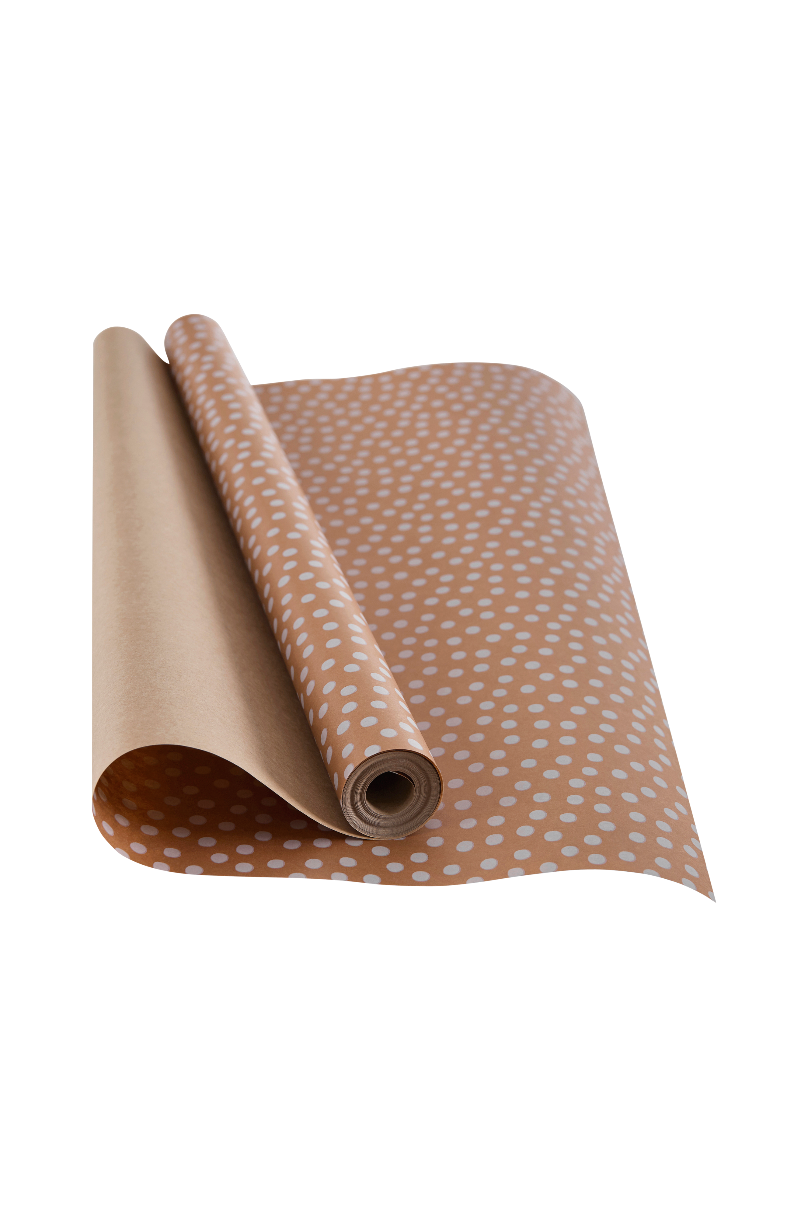 Lahjapaperi, jossa painettu pilkkukuvio. Mattapintainen ruskea paperi 80 g. Leveys 57 cm. Rullassa 10 metriä.