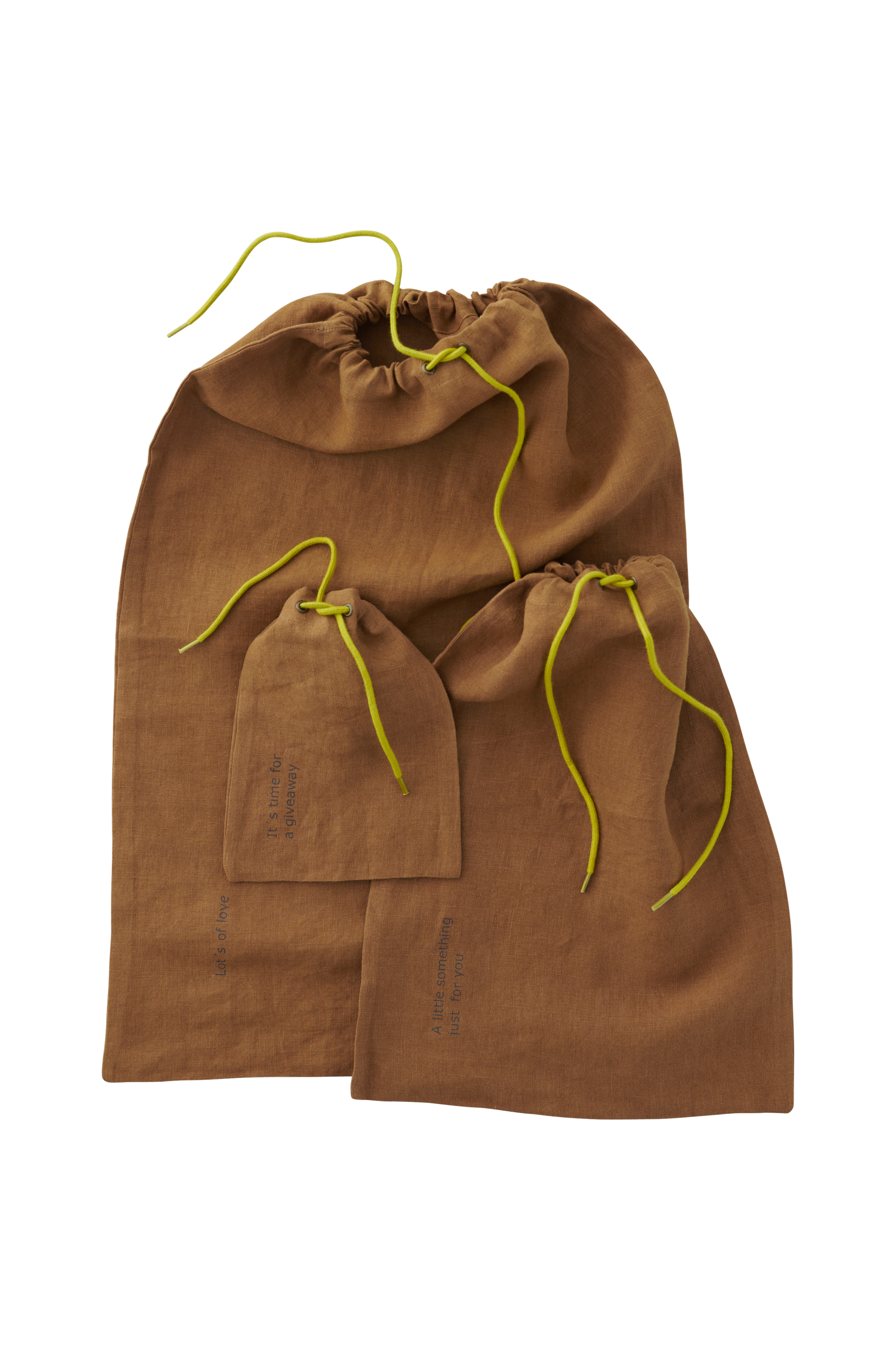 Lahjapussi pellavakangasta. Kiristysnyöri, joka kulkee metallirenkaiden läpi. Painettu teksti pussissa.
