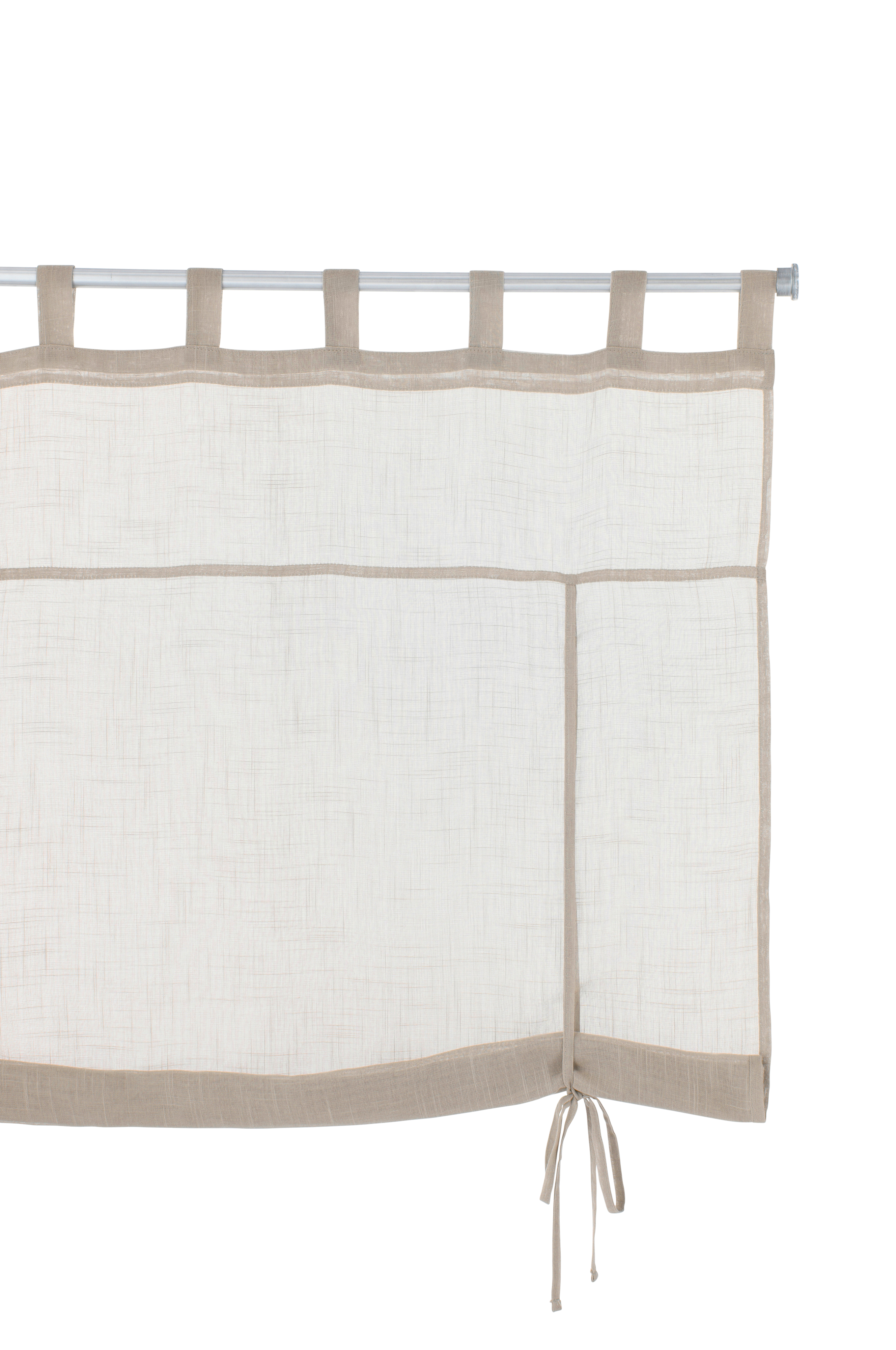 Laskosverho läpikuultavaa polyesteriä, jossa pellavamainen pinta. Rullautuva. Rullataan ylös ja kiinnitetään solmimisnauhoilla. Lenkit, jotka pujotetaan verhotankoon. Pujota alareunan kujaan pyöreä lista (ei mukana).