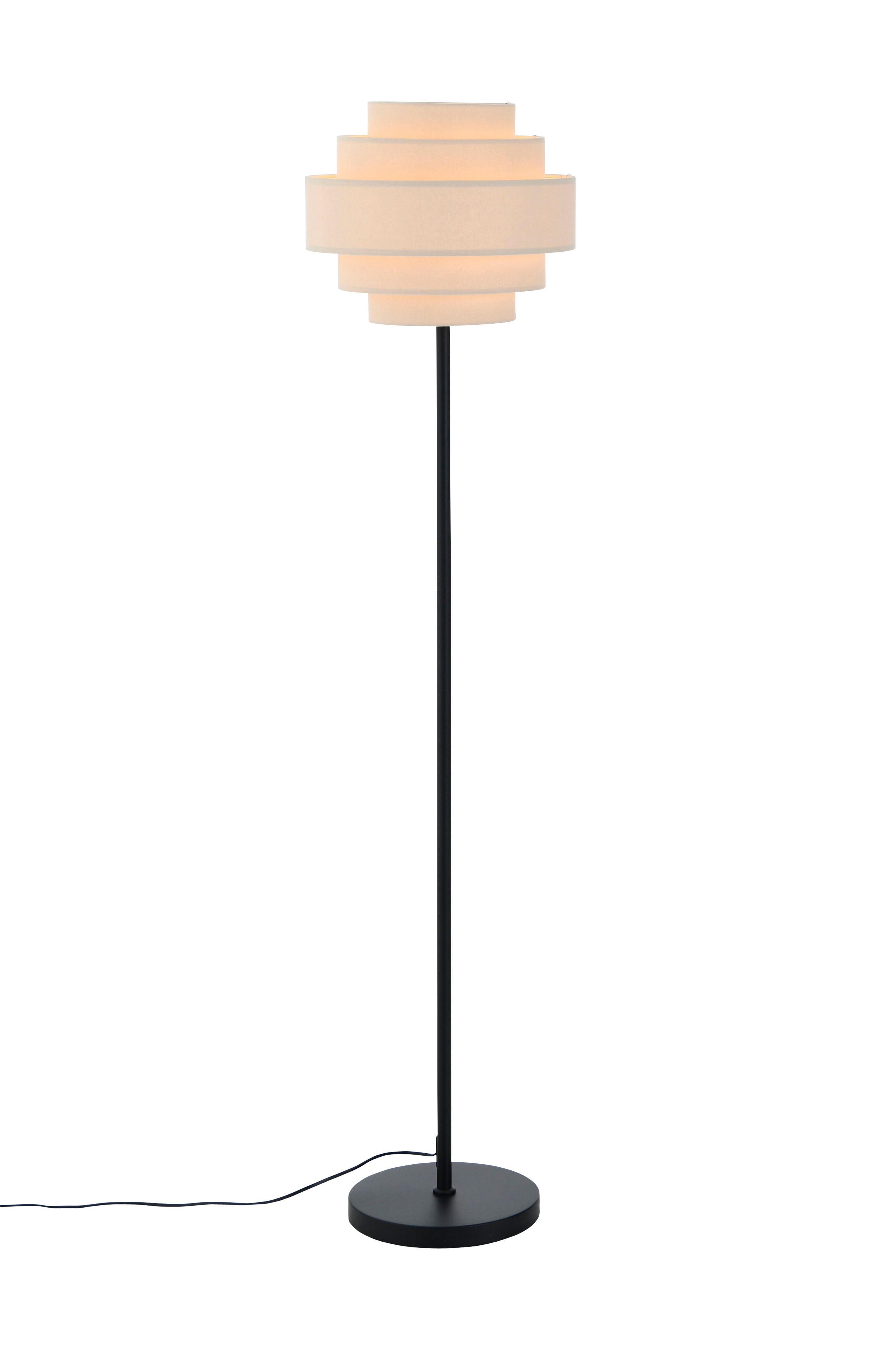 Lattiavalaisin, jossa mattamusta metallijalka ja puuvillavarjostin. Varjostimessa on useita erikokoisia osioita. Kokonaiskorkeus: 145 cm, josta lampunvarjostimen korkeus 28,5 cm. Musta johto, jossa virtakatkaisin. Valonlähde ei sisälly toimitukseen.