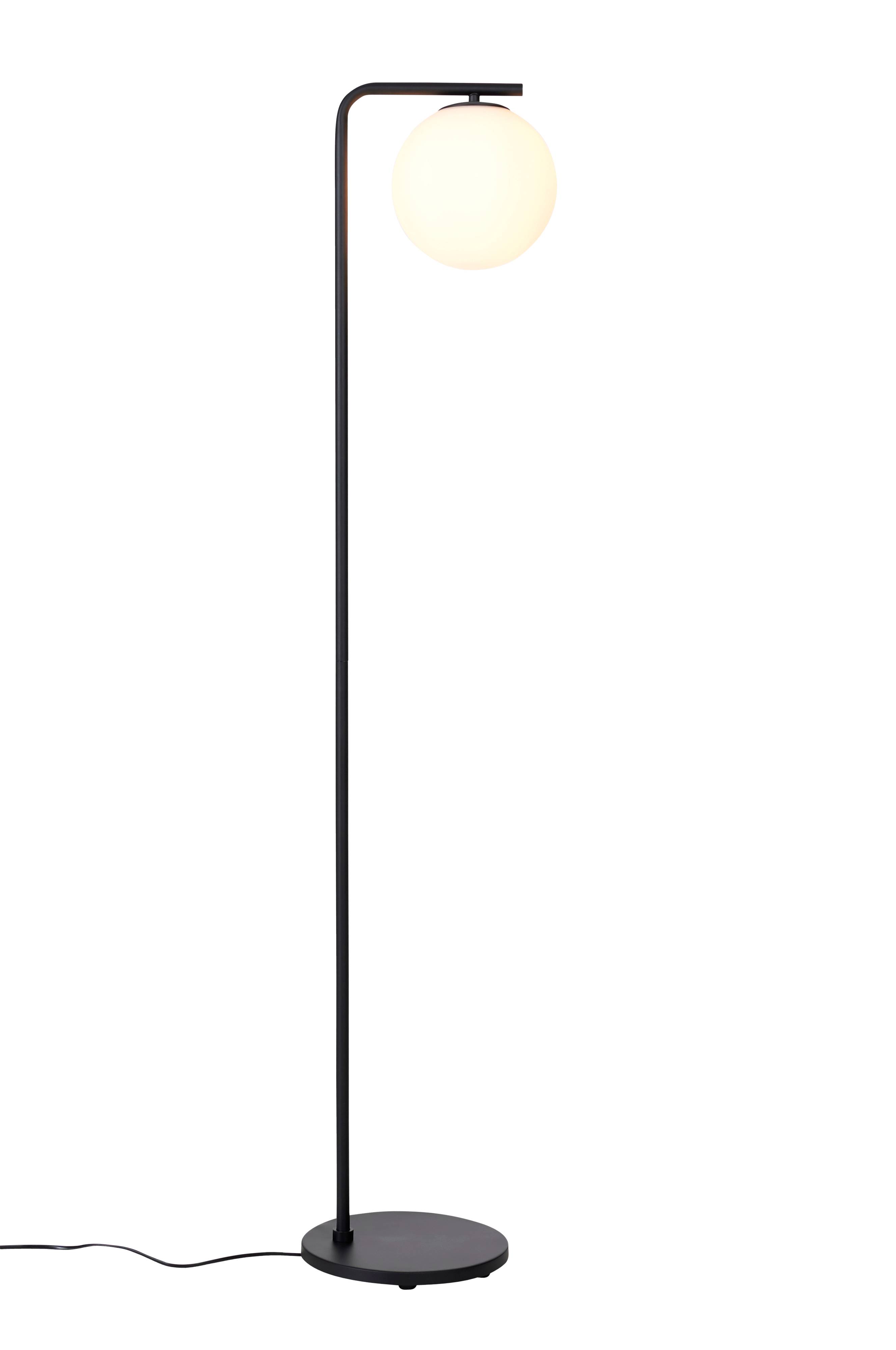 Lattiavalaisin metallia. Kupu valkoista opaalilasia, halkaisija 20 cm. Kupu kiinnitetään ja irrotetaan ruuvaamalla. Pohjalevyn mitat: Halkaisija 25 cm, korkeus 1,5 cm. Musta muovijohto, jossa lattiakatkaisin.