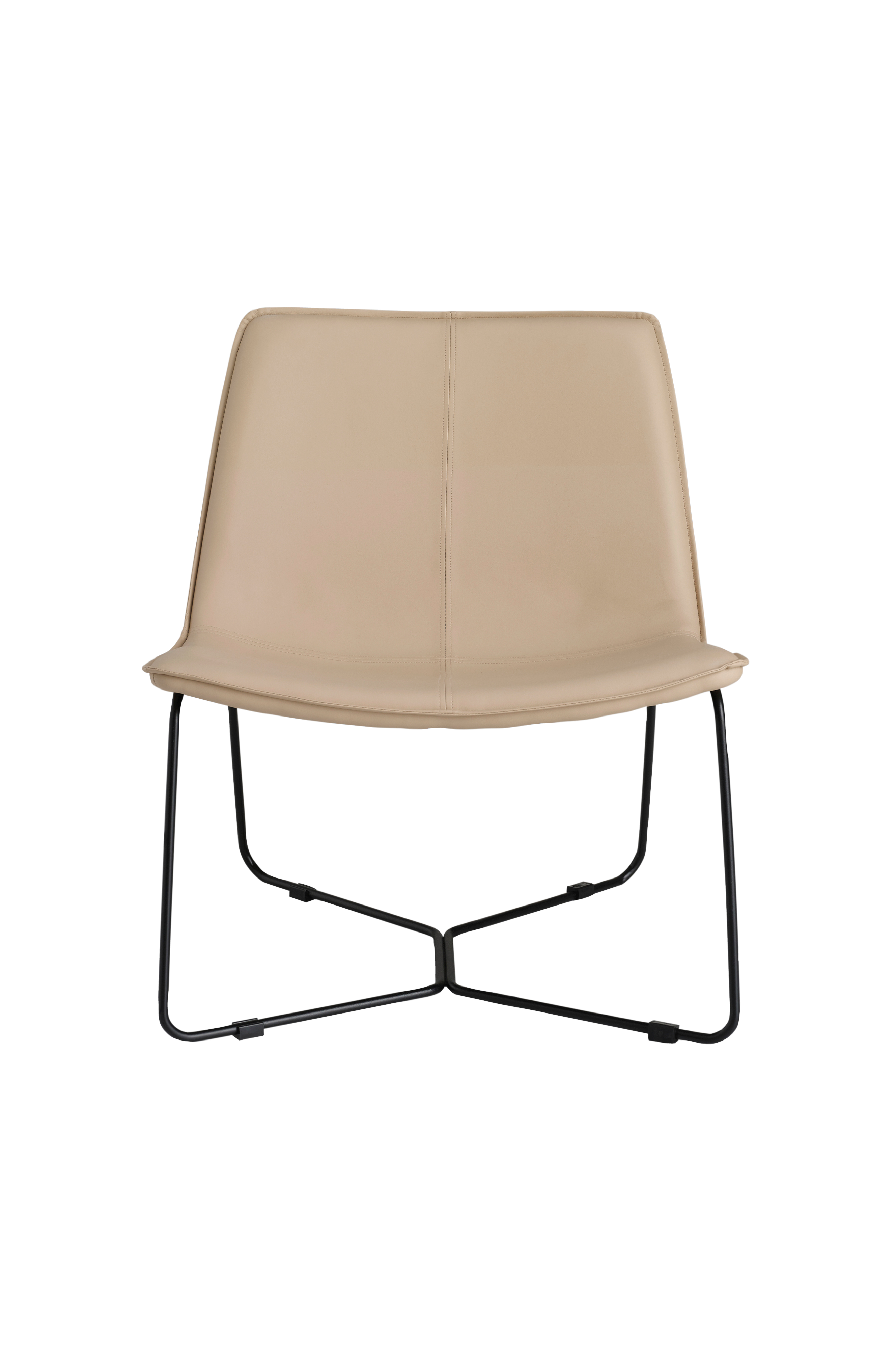 Loungetuolin päällinen polyuretaania (nahkajäljitelmää), jossa elävä sointuvan sävyinen kuvio. Farkkusauma keskellä edessä sekä istuimessa että selkänojassa. Jalat jauhemaalattua metallia. Vaahtotäyte.