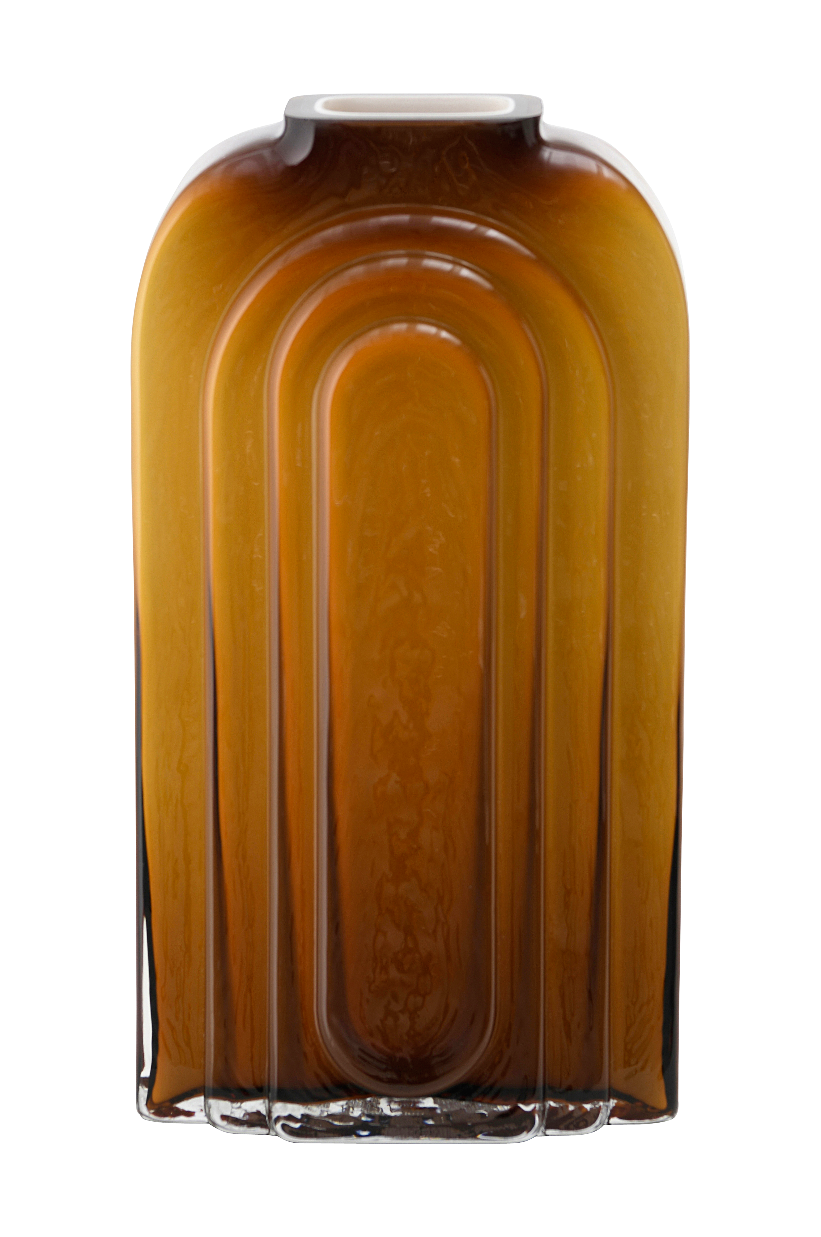 Holvimainen lasimaljakko, jossa reliefikuvio. Ylhäällä aukko, jonka sisämitat: 4,5 cm x 3,5 cm.