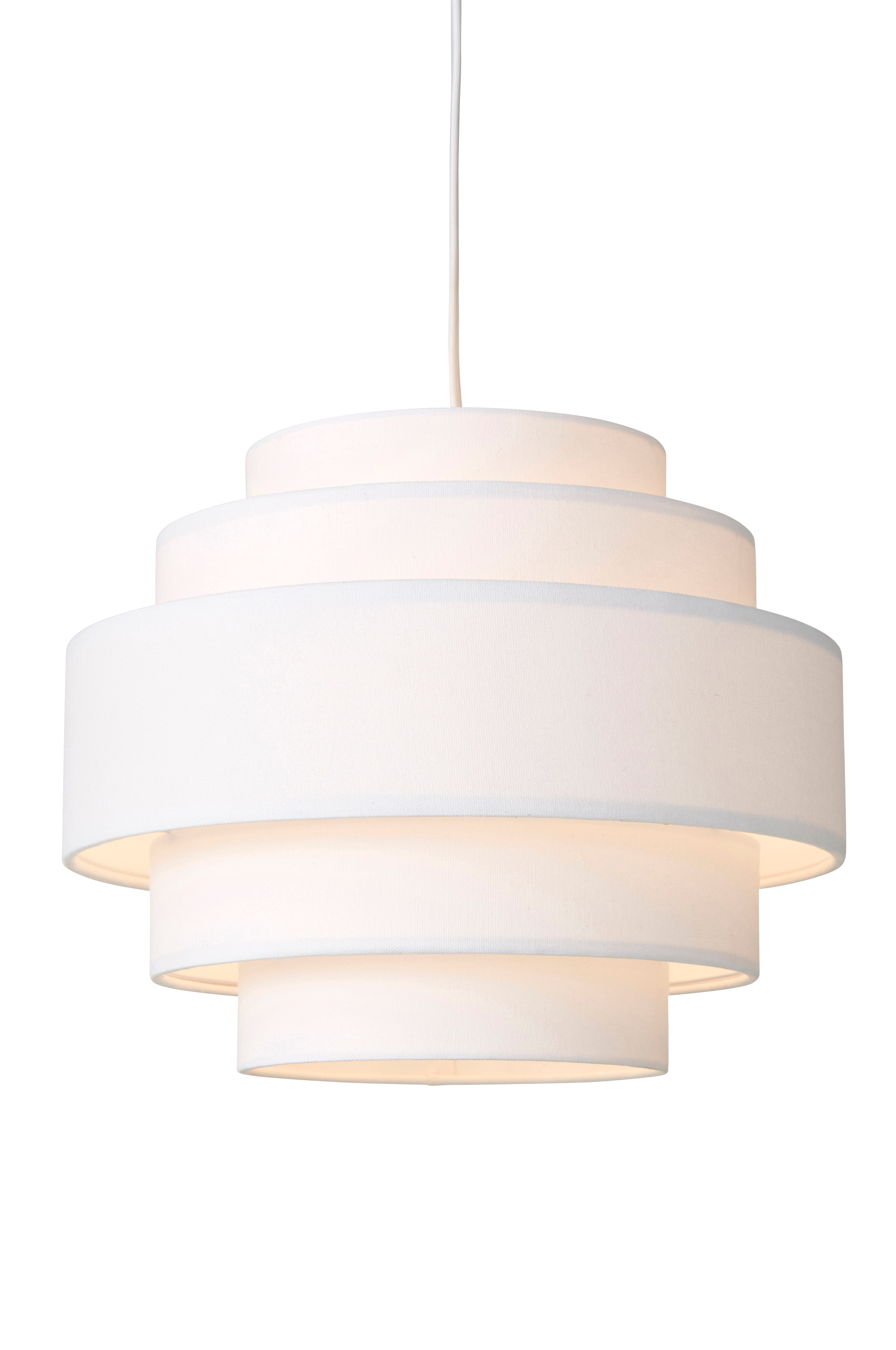 Kattovalaisin, jonka kangasvarjostimessa monta erikokoista kerrosta. ø n. 35 cm. Korkeus 28 cm. Muovinen kattokuppi, jossa ripustuskoukku ja suoraliitäntä (ei kruunupistoketta). Johdon pituus 120 cm.