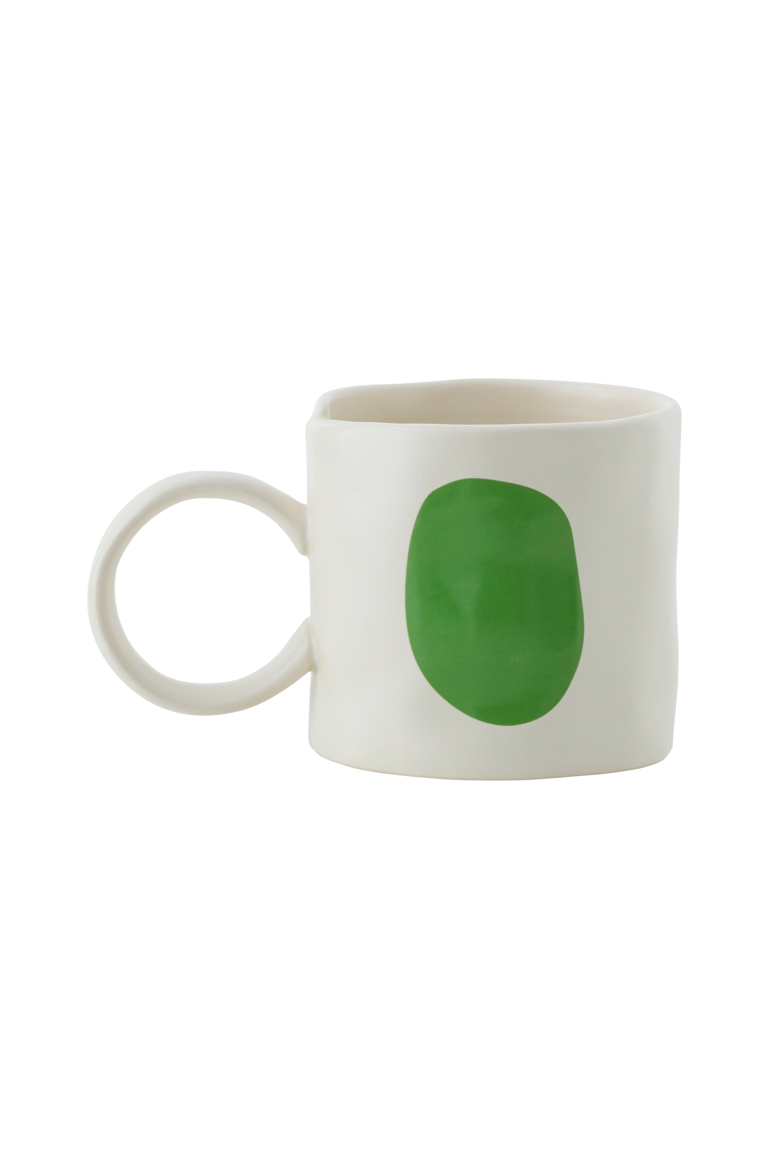 Muki lasitettua kivitavaraa. Korkeus n. 14 cm. Halkaisija 8,5 cm.