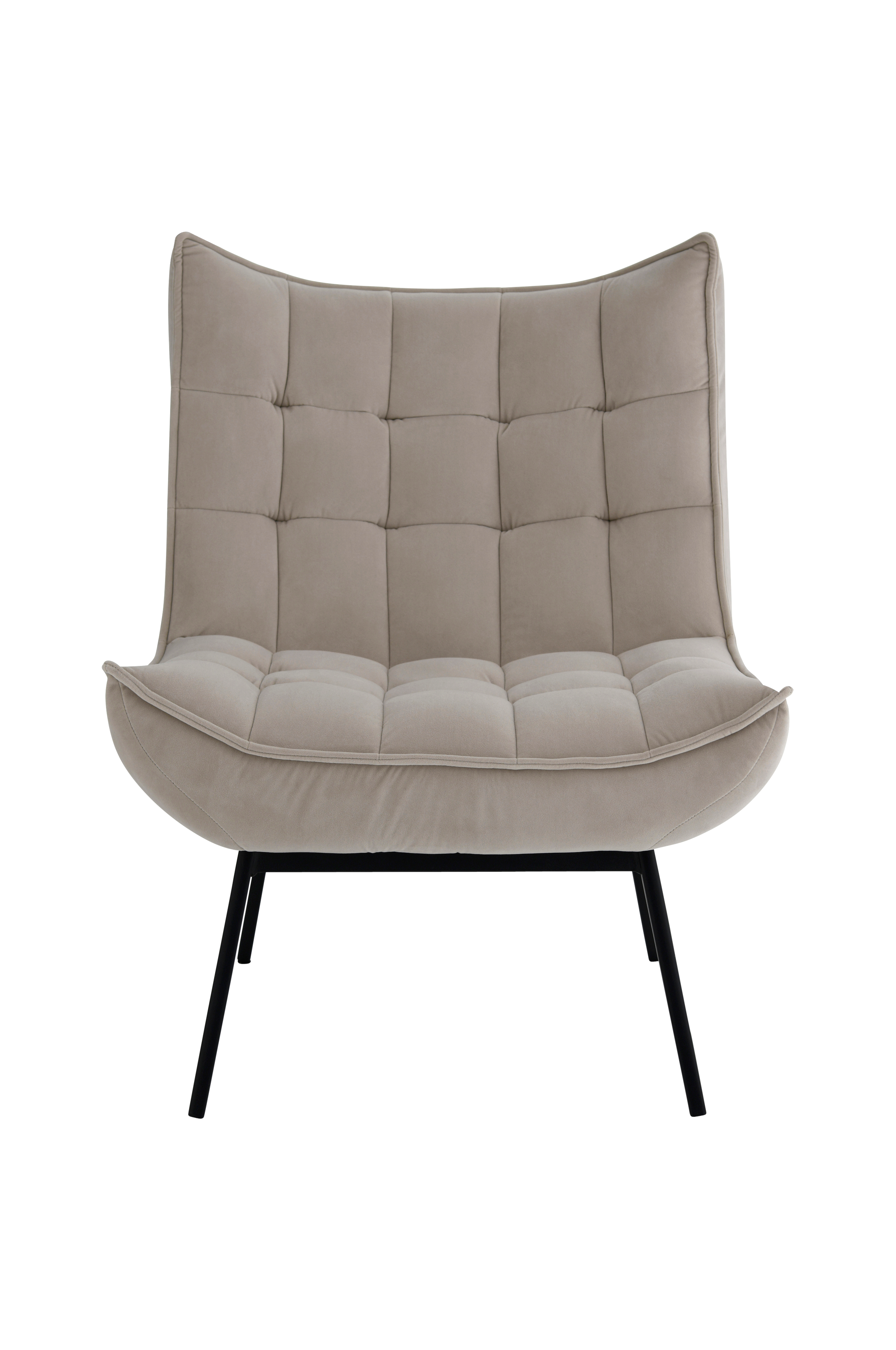 Nojatuolissa on terenauhareuna ympäriinsä. Syvät tikkaukset muodostavat koristeellisen ruutukuvion. Vaahtotäyte. Metallijalat. Helppo koota.