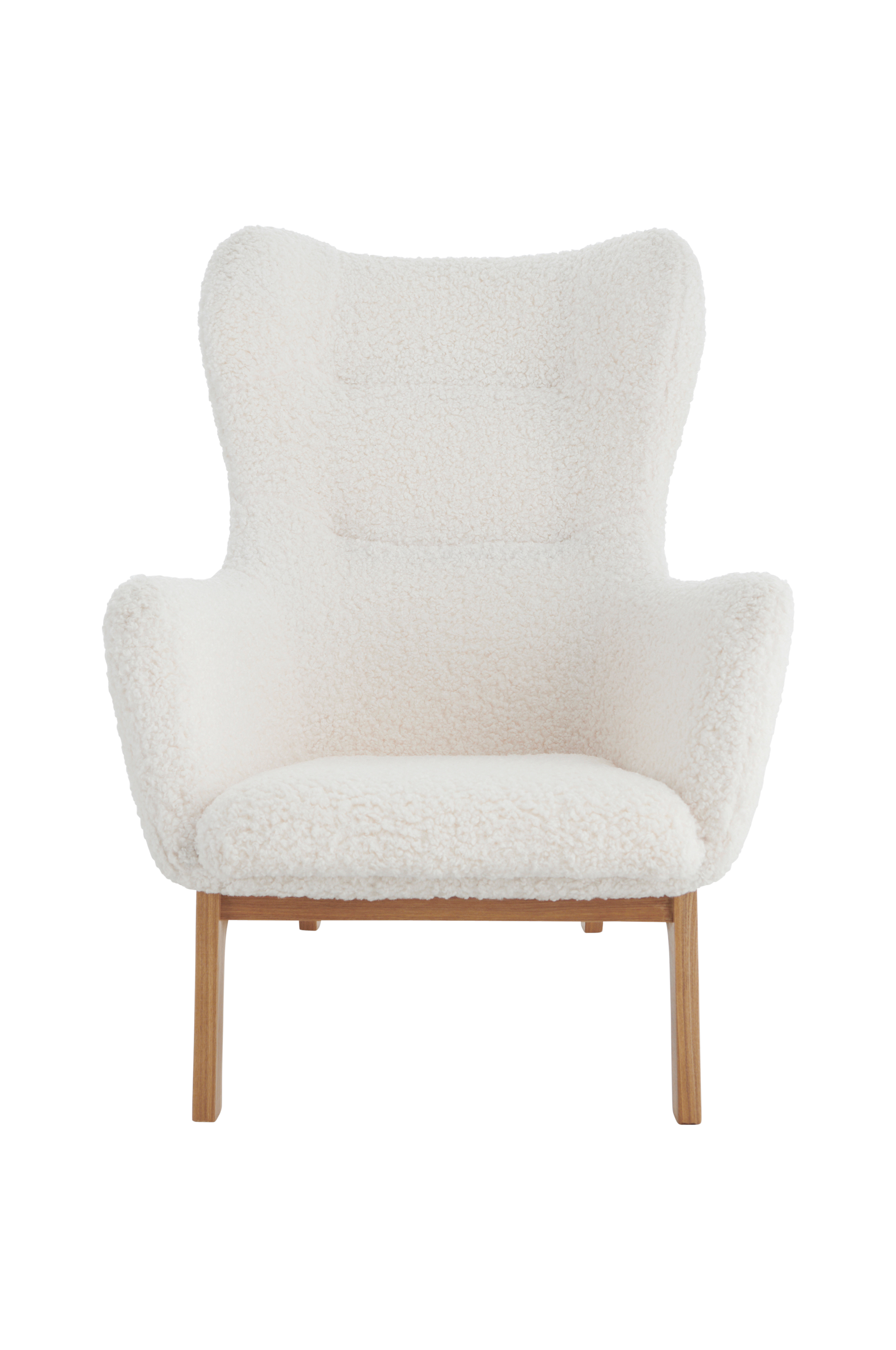 Nojatuoli, jossa runko massiivisaarnea ja päällyskangas polyesteristä valmistettua lampaankarvajäljitelmää.