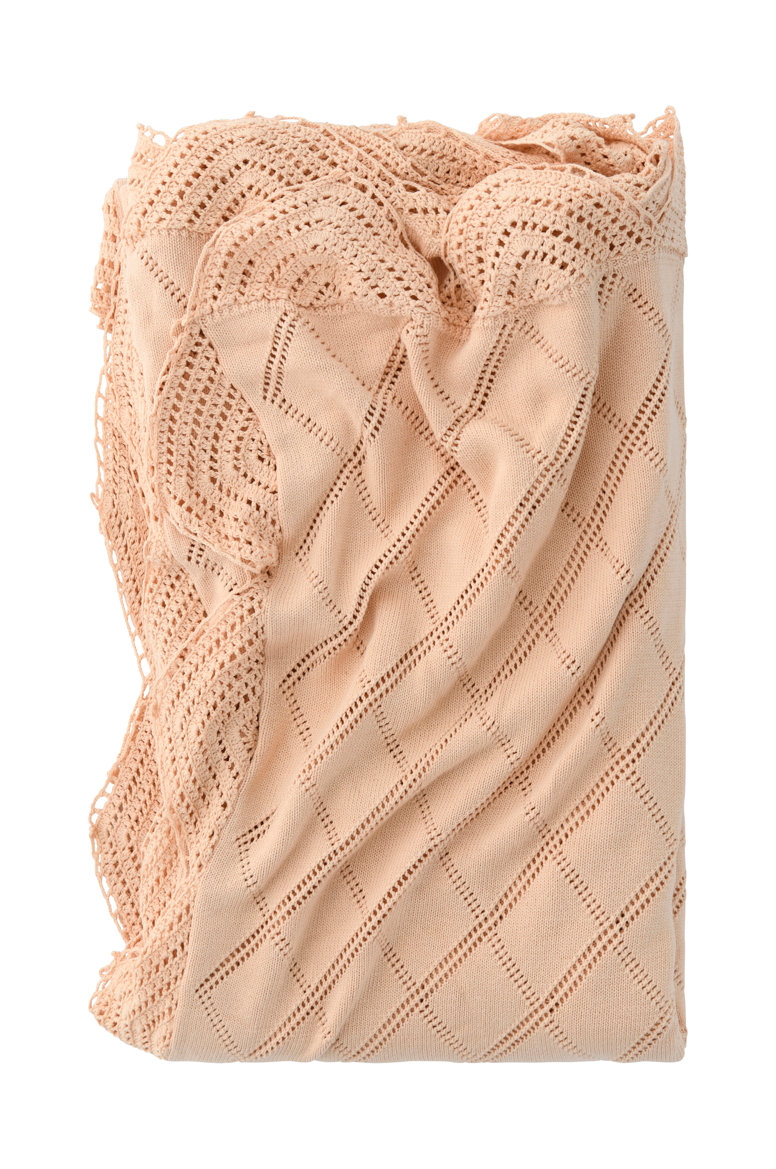 Neulottu päiväpeite pestyä puuvillaa, jossa virkattu reuna ympäriinsä. Kirjailtu kuvio.