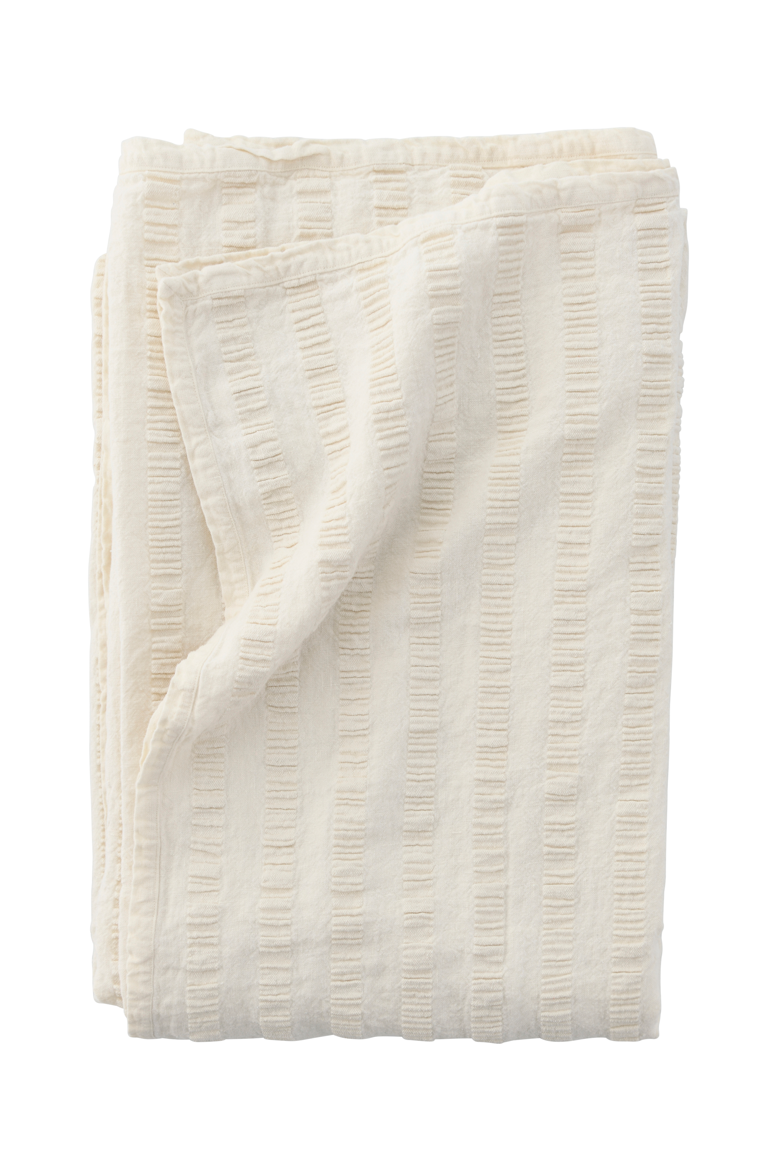 Päiväpeite pellavasta ja puuvillasta valmistettua napakkaa kreppimateriaalia (seersucker), jossa klassinen pintakuvio. Nauhareunus ympäriinsä.
