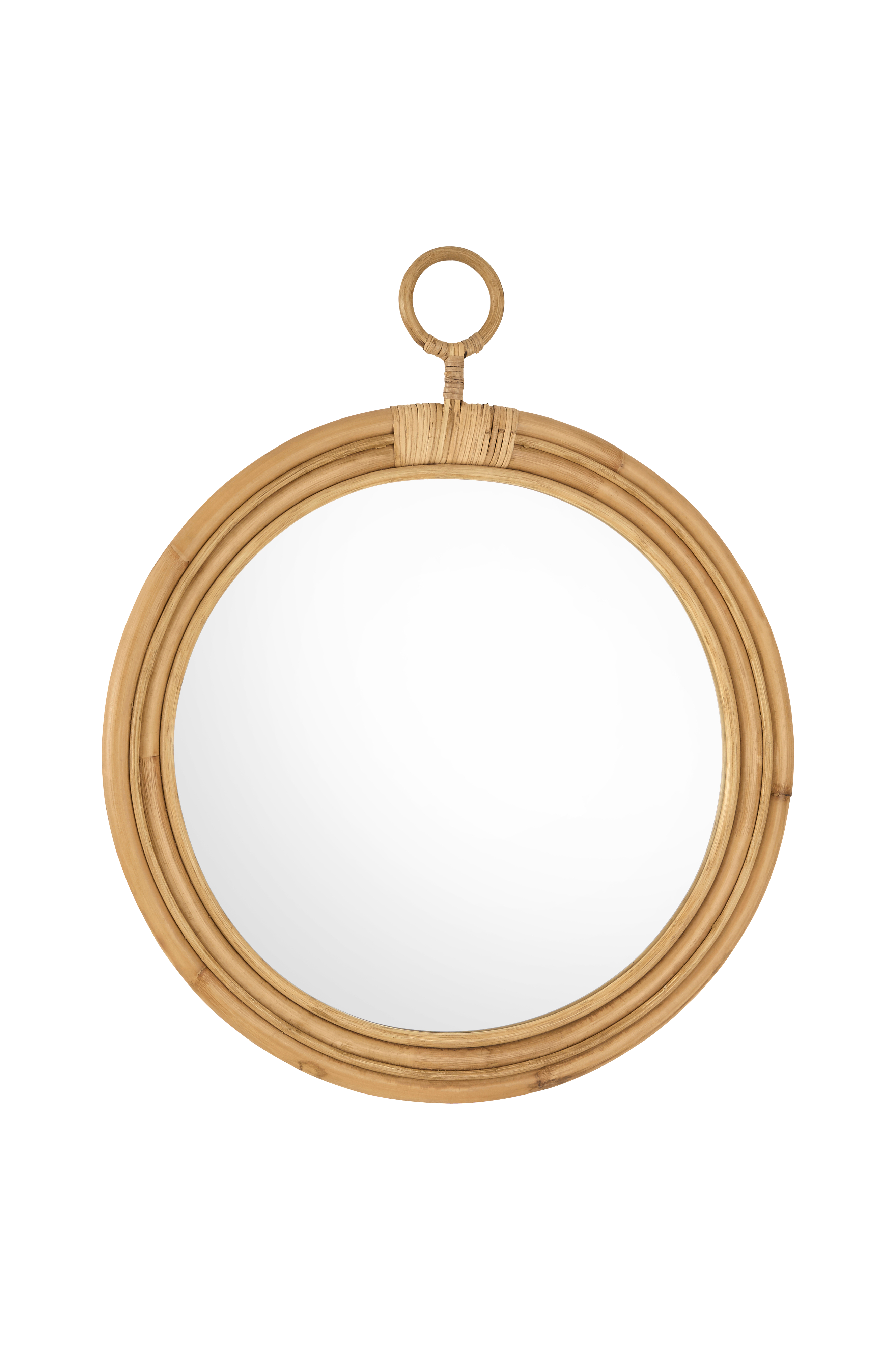 Peili, jonka kehys ja ripustuslenkki rottinkia. Kokonaismitat: Korkeus ripustuslenkin kanssa 73 cm, syvyys 2,5 cm ja halkaisija 60 cm. Peililasin Ø 47 cm.