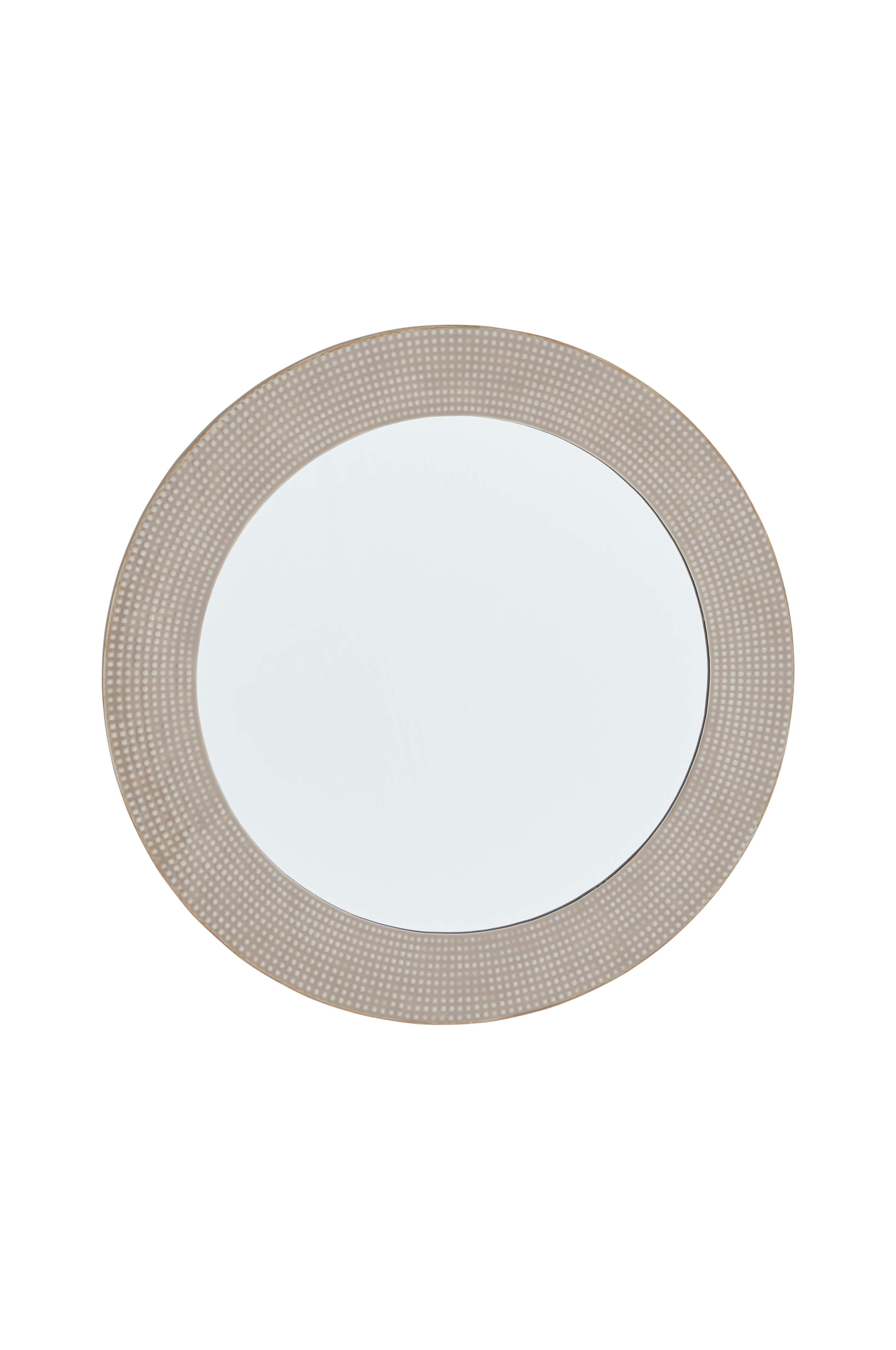 Pyöreä peili, jonka kehys maalattua metallia. Taottu kuvio. Tausta MDF-levyä. Peilin sisähalkaisija 40 cm. Ripustetaan seinälle.