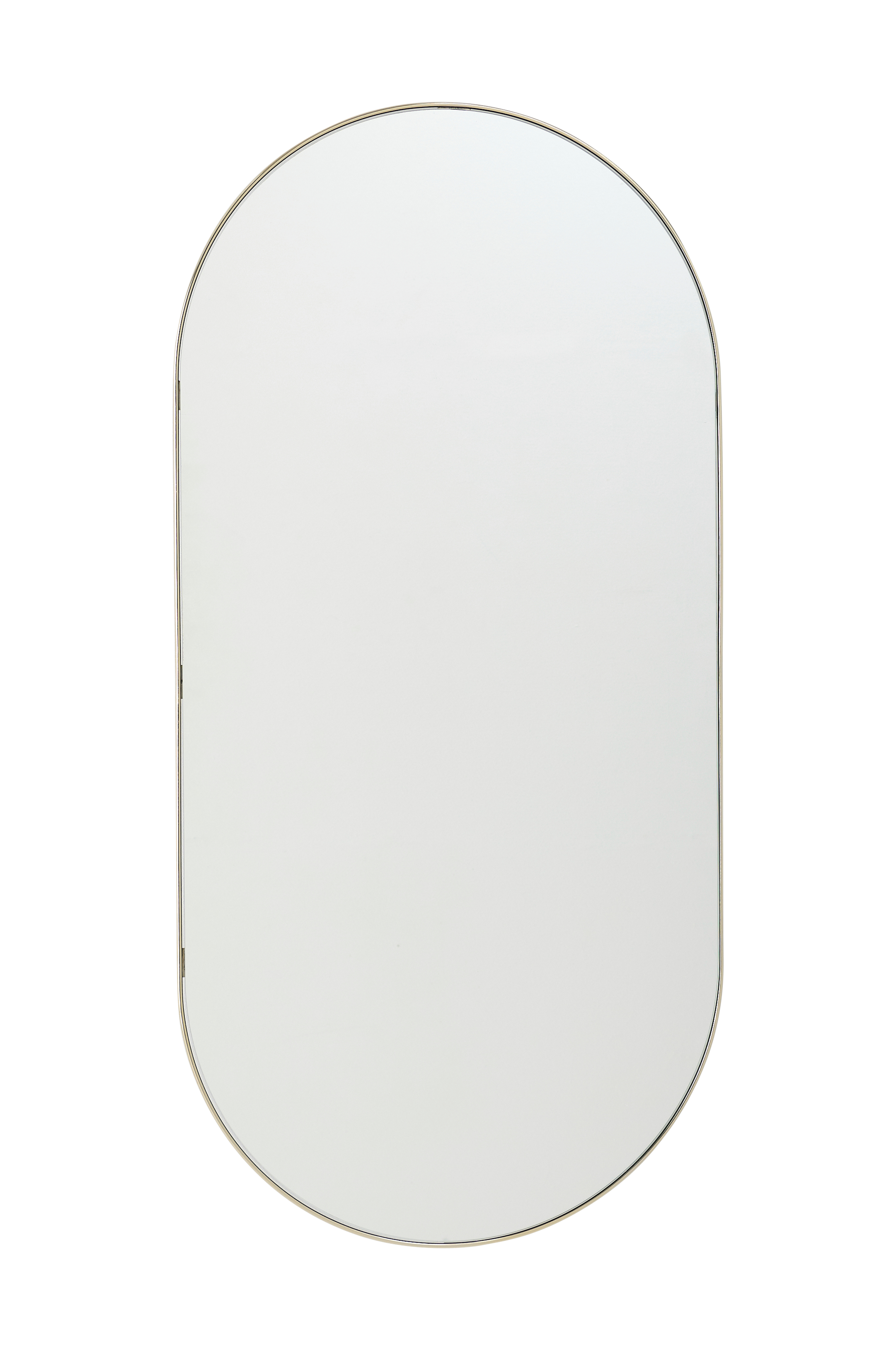 Soikea peili, jossa metallikehys 6 mm. Korkeus 119,5 cm, leveys 59 cm, syvyys 1,5 cm. 4 seinäkiinnikettä takana.