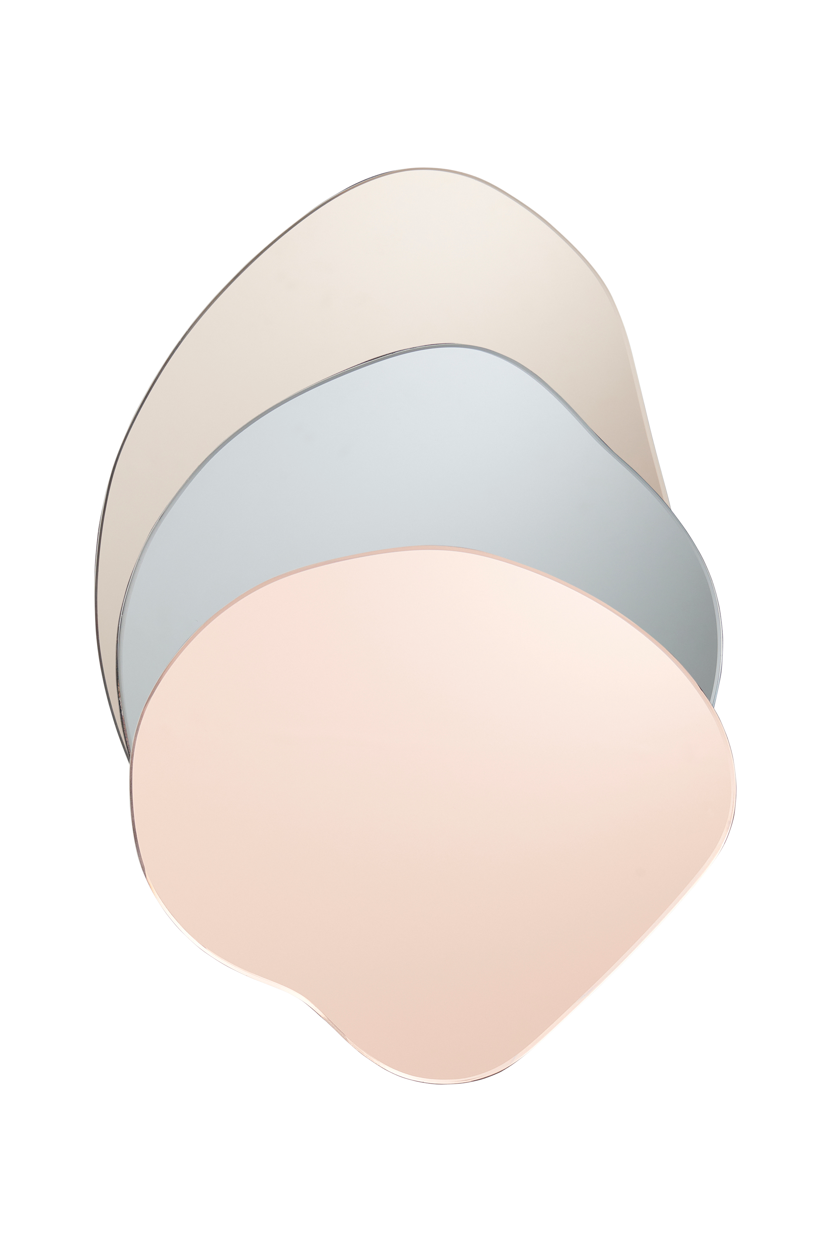 Kolme yhteensopivaa erikokoista, erimuotoista ja eriväristä seinäpeiliä sävytettyä lasia. Takaosa MDF-levyä. Peilit voi ripustaa seinälle eri tavoilla.
