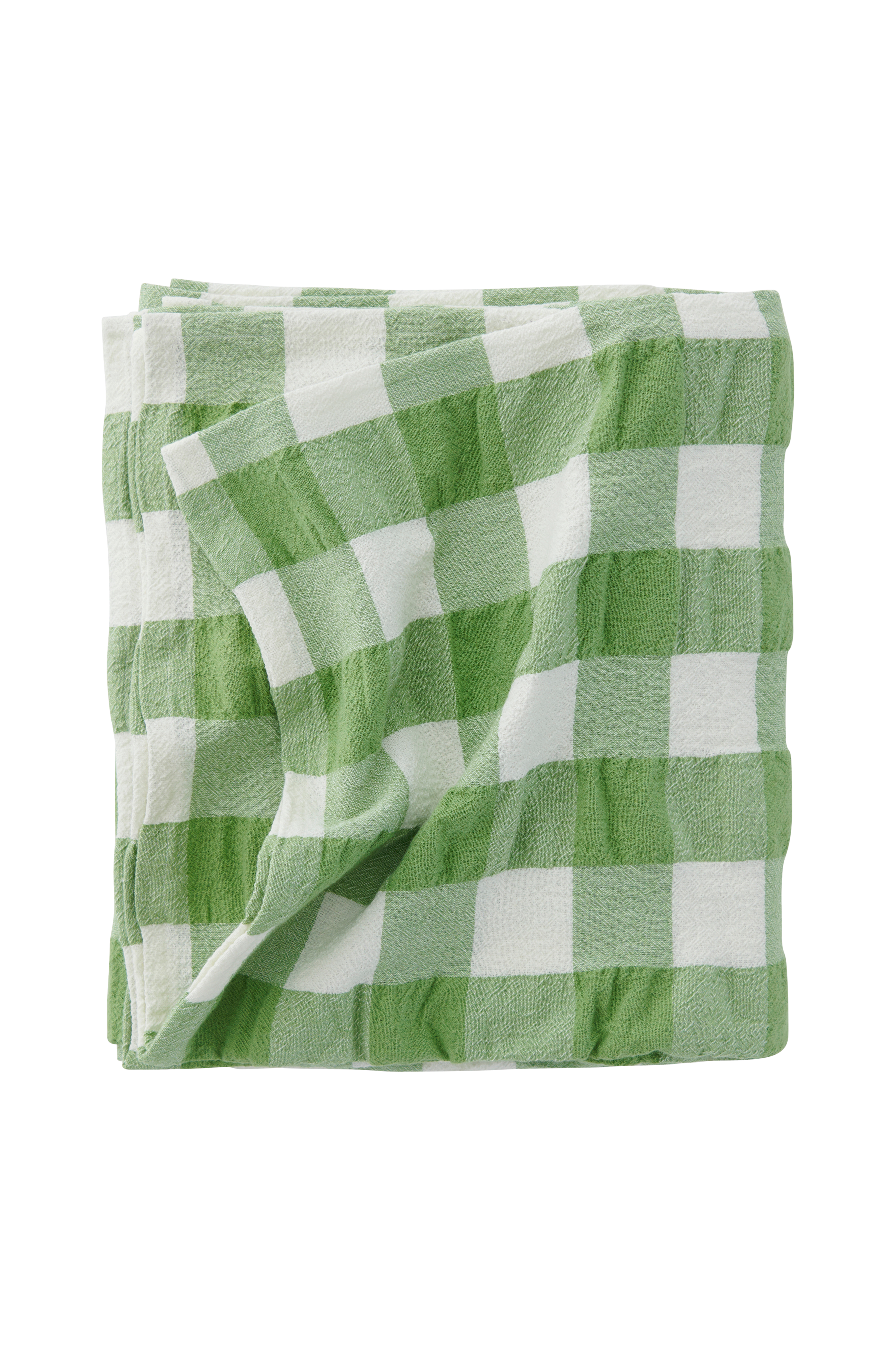 Ruudullinen pöytäliina eläväpintaista kreppikangasta (seersucker). Lankavärjätyt ruudut. Pestyä ekologista puuvillaa.