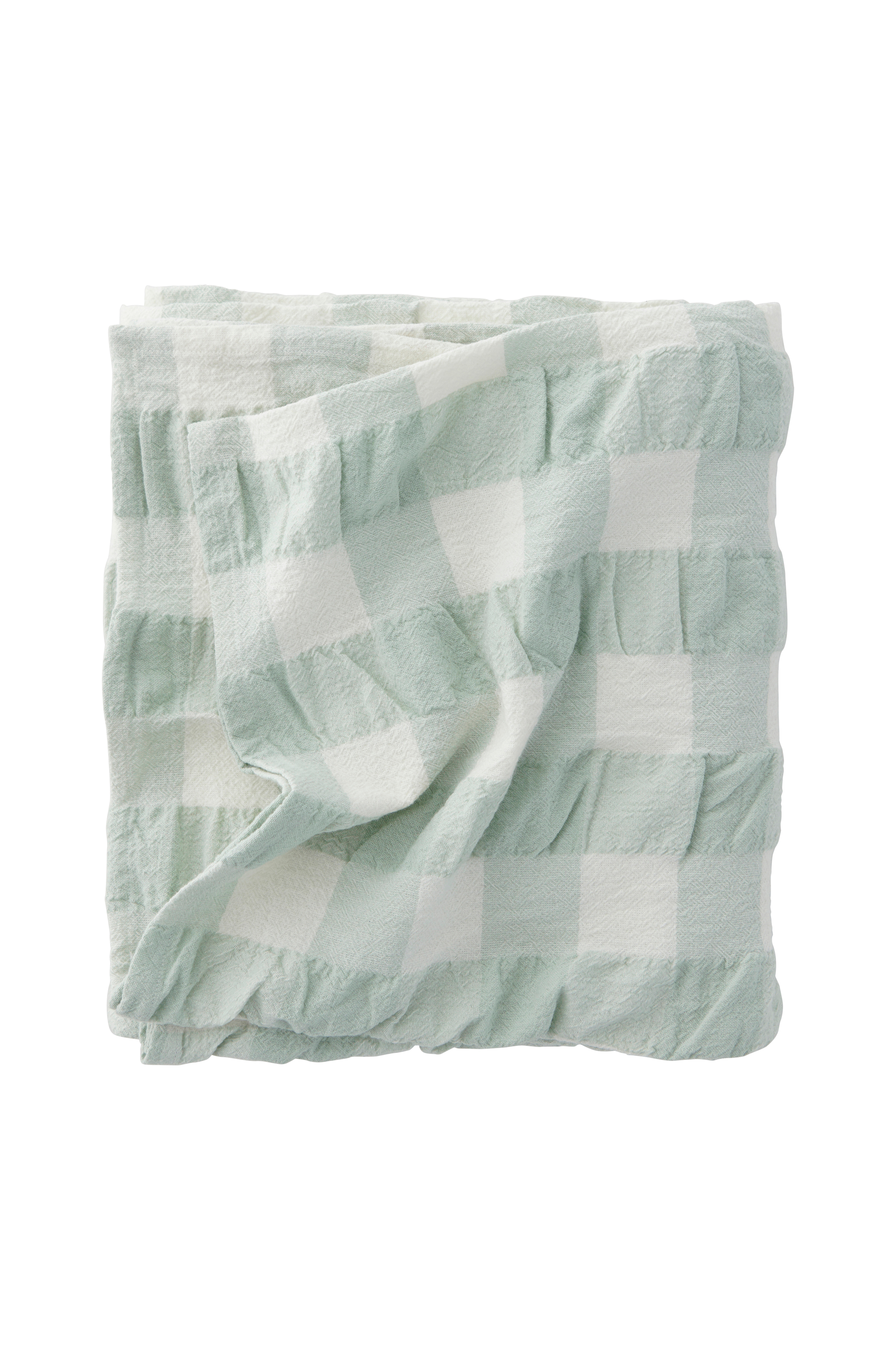 Ruudullinen pöytäliina eläväpintaista kreppikangasta (seersucker). Lankavärjätyt ruudut. Pestyä ekologista puuvillaa.