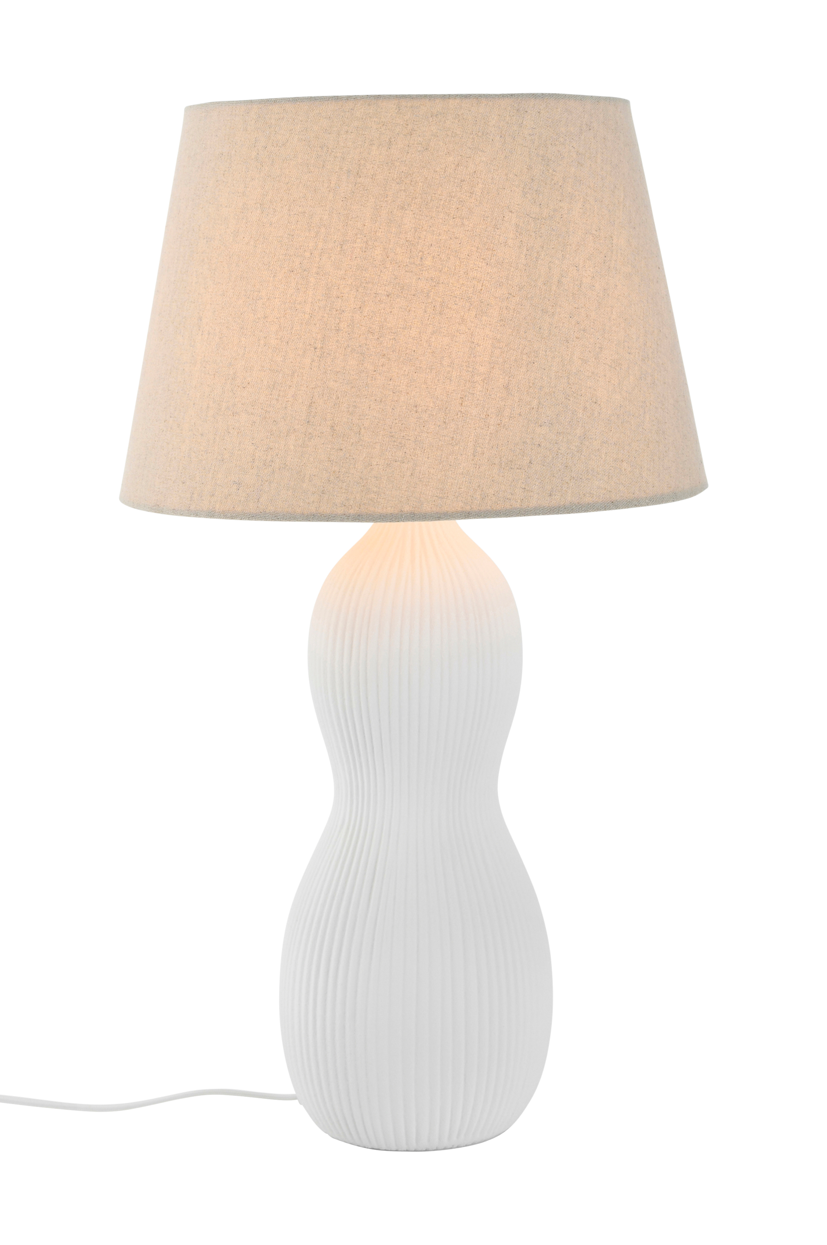 Pöytävalaisin, jonka jalka mattapintaista keramiikkaa. Lampunjalka on orgaanisen muotoinen ja siinä on raidallinen pintakuvio. Kangasvarjostin.