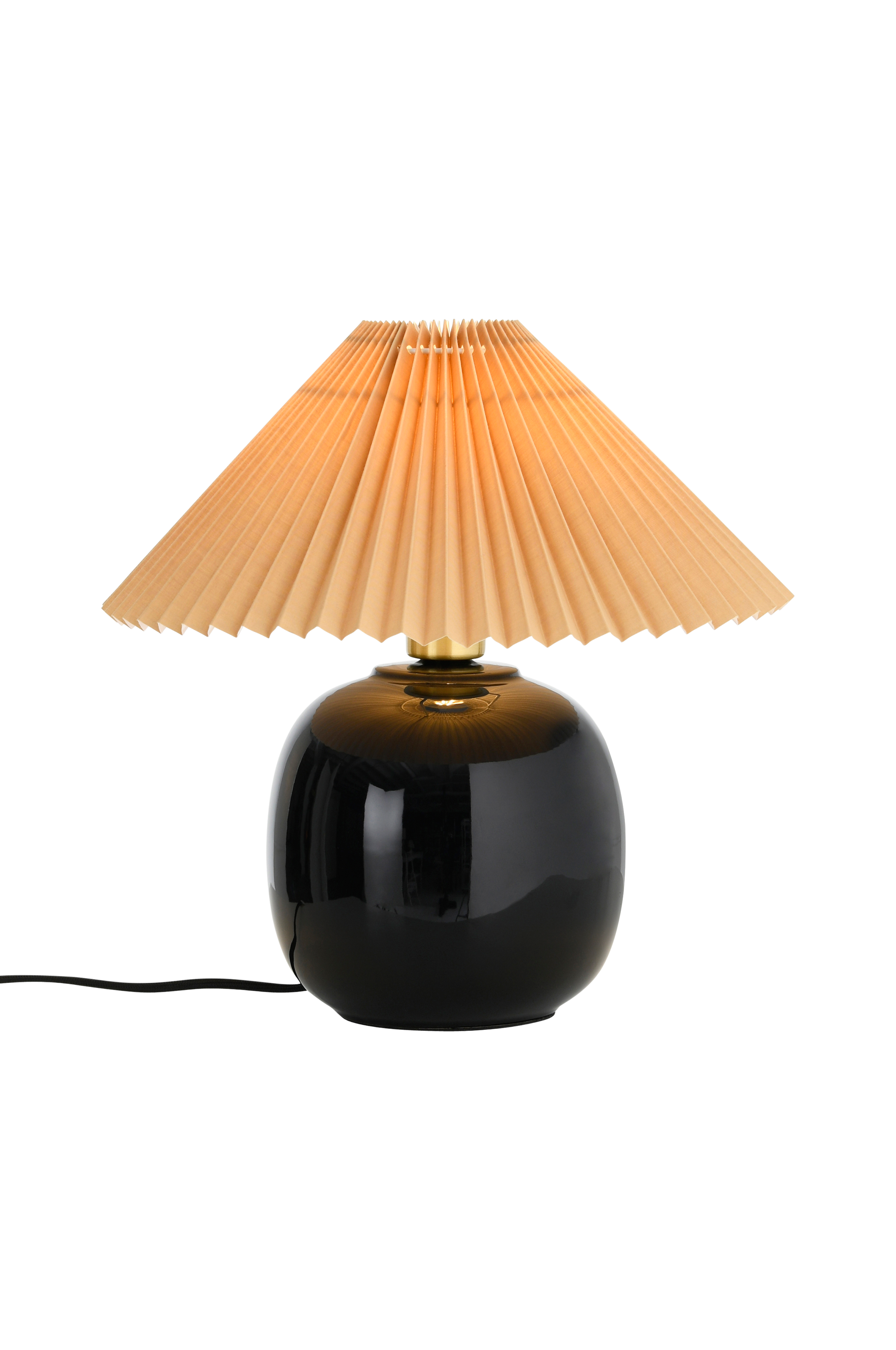 Pöytävalaisimessa on lasitettu keramiikkajalka. Laskostettu kangasvarjostin. Lampunkanta antiikkimessinginväristä metallia.