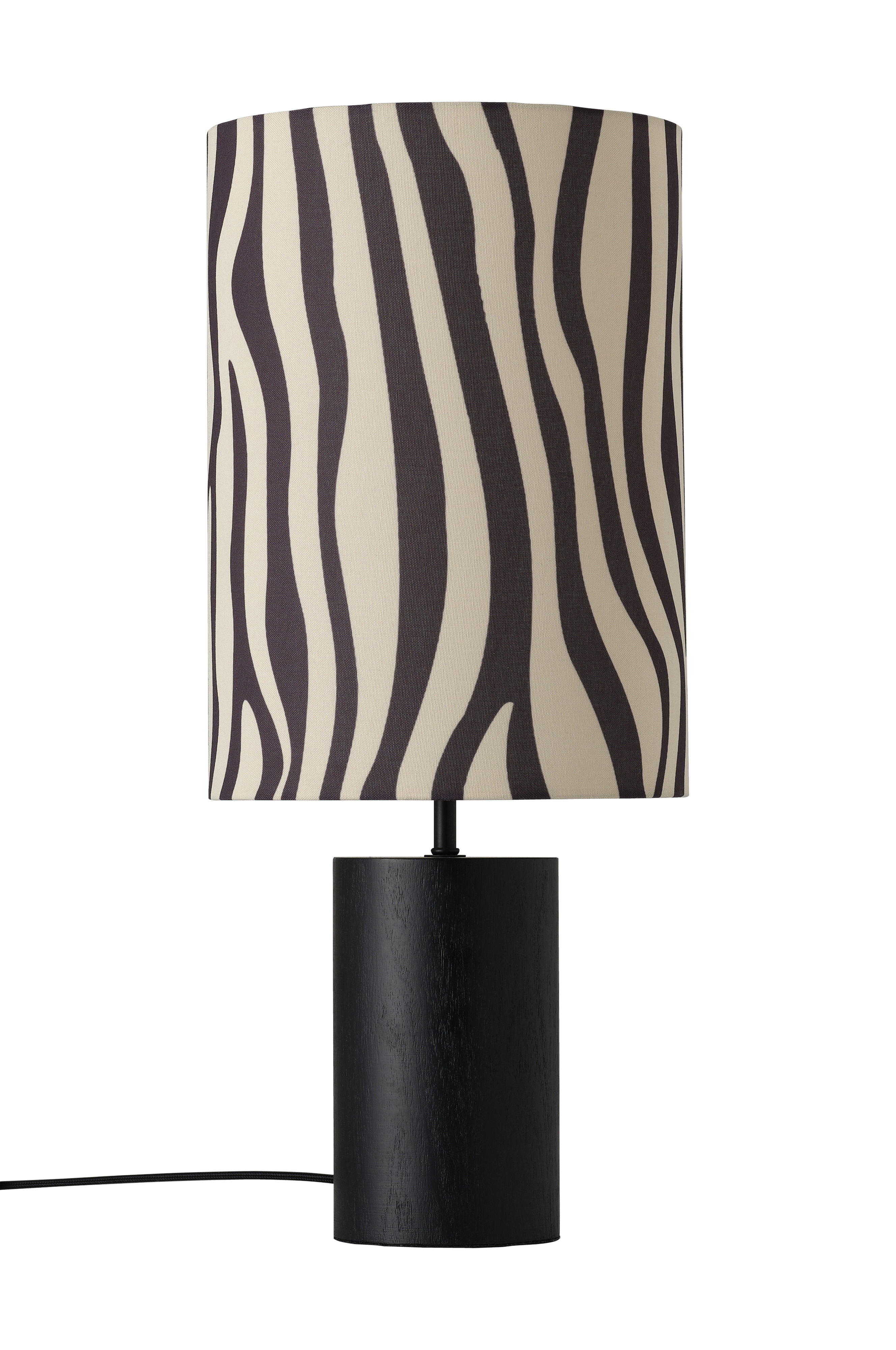 Pöytävalaisimen kangasvarjostin paksuhkoa kangasta, jossa painettu kuvio. Lampunjalka puuta, jossa mattamusta, maalattu viimeistely. Varjostimen koko: Halkaisija 25 cm, korkeus 35 cm. Jalan mitat: Halkaisija 12 cm, korkeus 20 cm. Musta kangasjohto, jossa virtakatkaisin. Valonlähde ei sisälly toimitukseen.