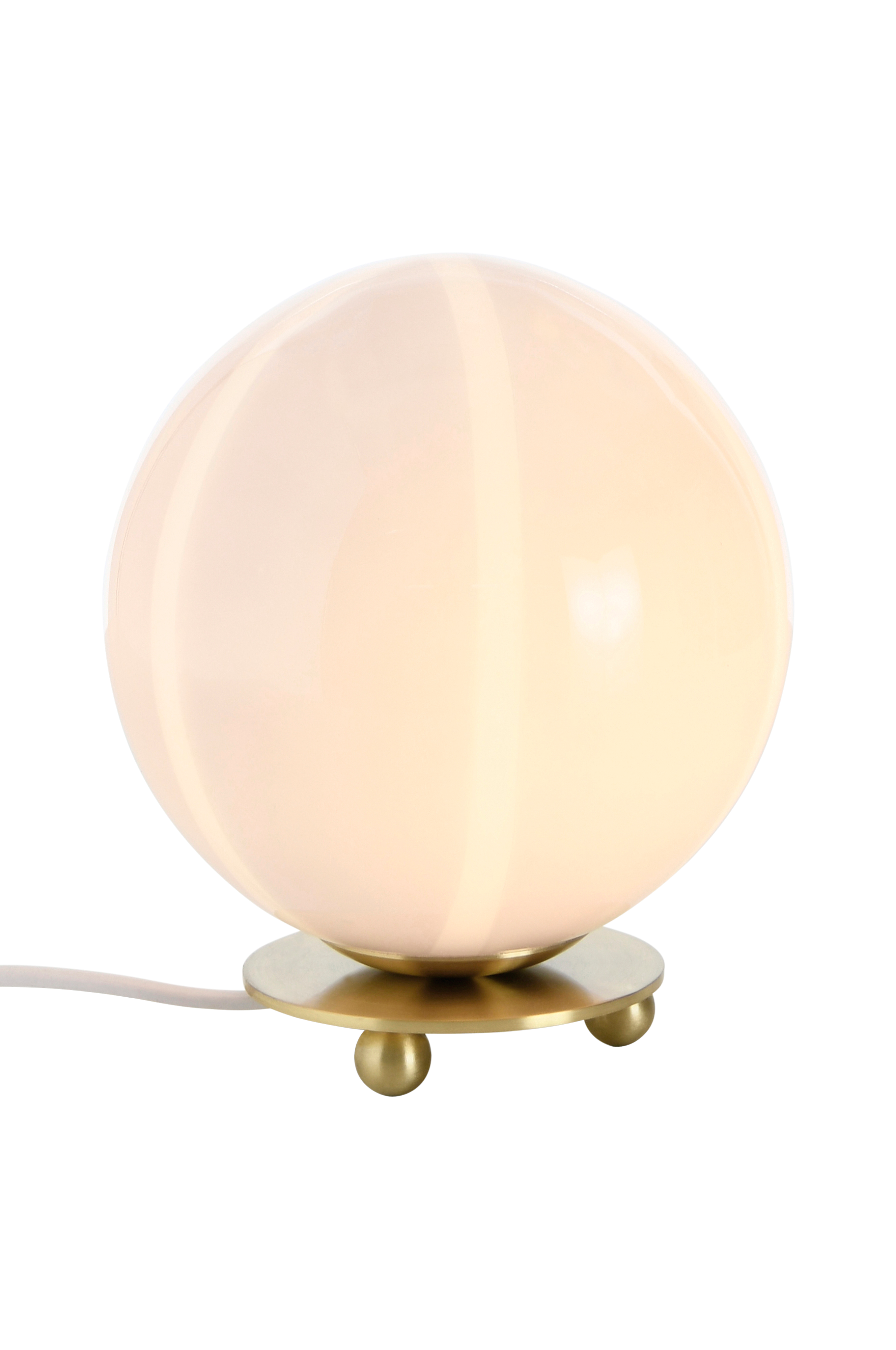 Pyöreä pöytävalaisin raidallista lasia. Valkoinen johto, jossa virtakytkin.