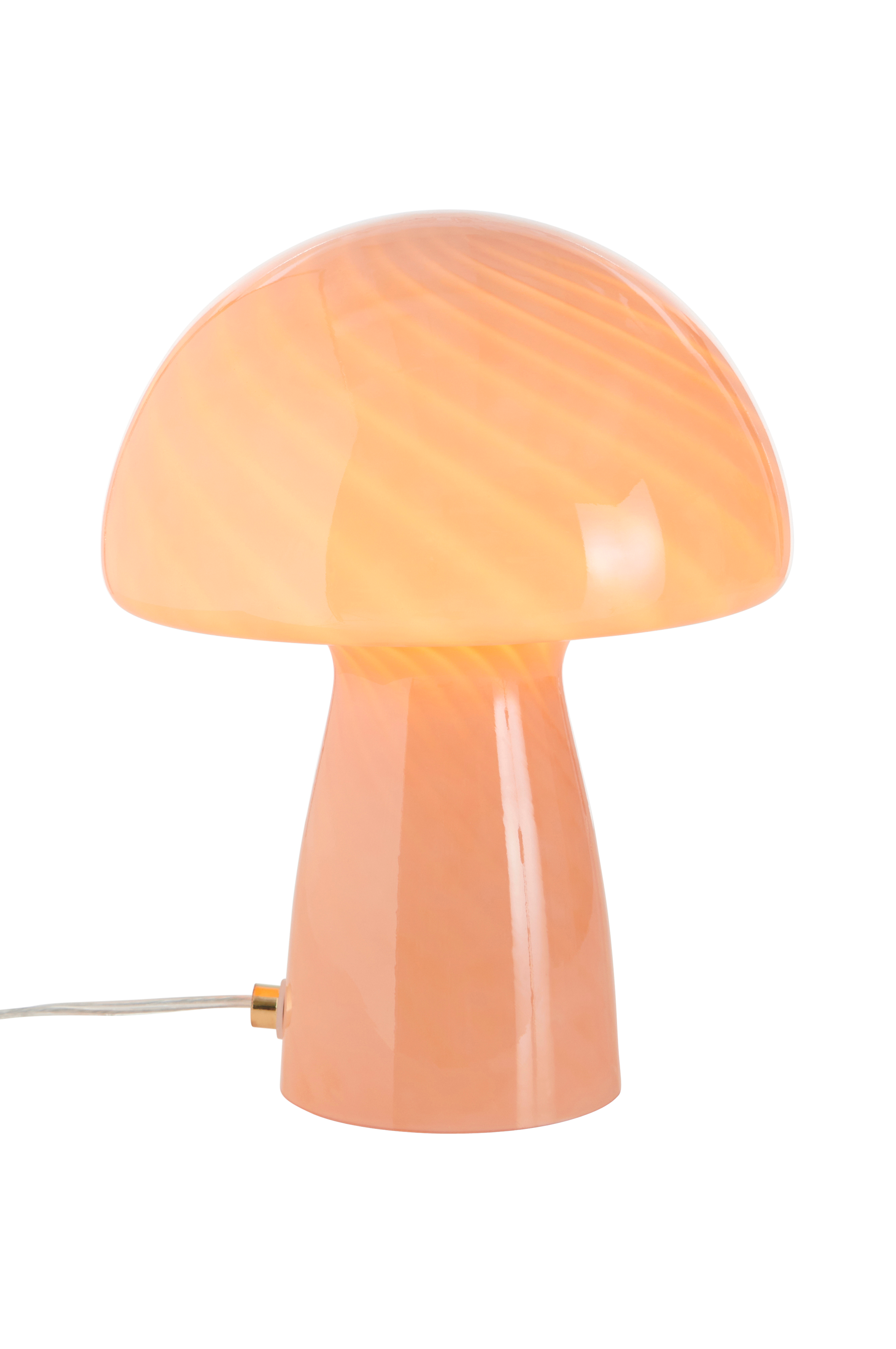 Pöytävalaisin raidallista kiiltävää lasia, jossa valkoiseksi maalattu sisäputki ja ulkopuolella näkyvä yksityiskohta pinnoitettua messinkiä. Läpikuultava johto, jossa virtakytkin.