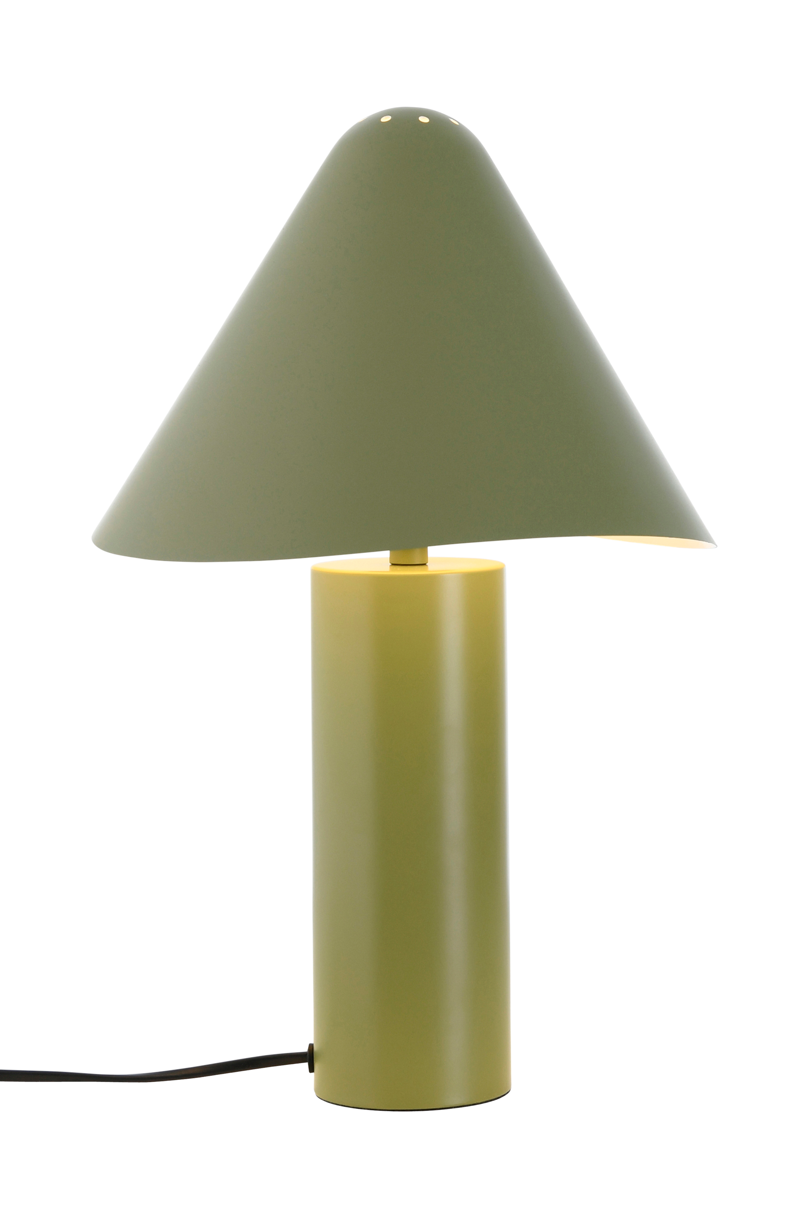 Metallinen pöytävalaisin, jossa orgaanisen muotoinen varjostin. Musta johto, jossa virtakatkaisin.